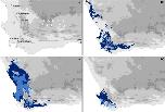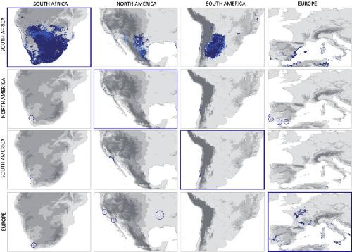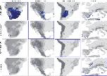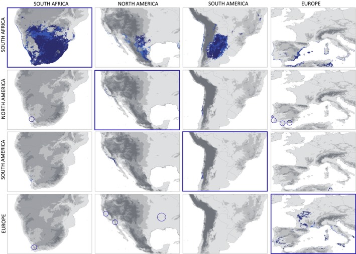 Figure 5. Crosswise projection of bdw models (dark blue) and mcp models (light blue) for native and invasive populations. The training area is marked by a blue frame and the respective projection areas can be found within the same row. Blue circles indicate the presence of small areas which are within the hypervolume computed for the training range