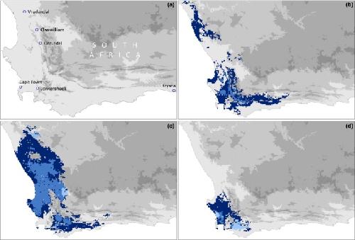 Figure 6. Potential areas of origin of the invasive populations of Xenopus laevis across South Africa (a), as well as predicted ranges based on training regions of North America (b), South America (c), and Europe (d).