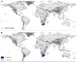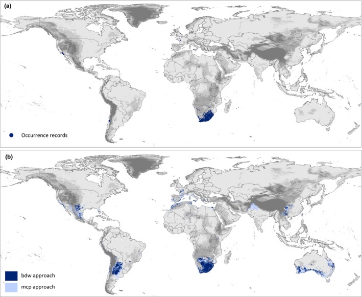Figure 4. Current global distribution (a) and potential distribution of Xenopus laevis as derived from the global hypervolume model trained with the complete set of species records (b)