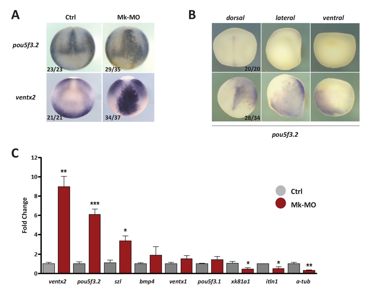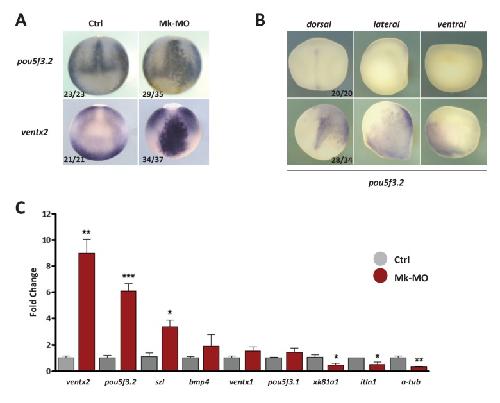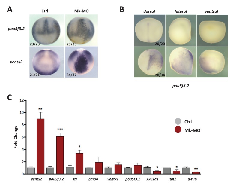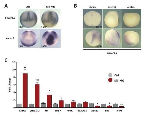 Figure 2âfigure supplement 2 MEK1 is required to inhibit the expression of the pluripotency genes pou5f3.2 and ventx2. (A) Embryos injected with 25 ng Mk-MO at 16-cell stage in one animal dorsal blastomere were grown until late gastrulation stage 13 and processed for WISH with pou5f3.2 and ventx2 probes. (B) Embryos injected with 25 ng Mk-MO at 16 cell stage in one animal ventral blastomere were grown until mid-neurula stage 18 and processed for WISH with pou5f3.2 probe. (C) Four-cell embryos were injected in each blastomere with 25 ng Mk-MO and grown until blastula stage 9, when animal caps were isolated, cultured in vitro until late gastrula stage 13 and then processed for RT-qPCR. In A and B, the number of embryos exemplified by the photograph over the total number of embryos analyzed is indicated. |