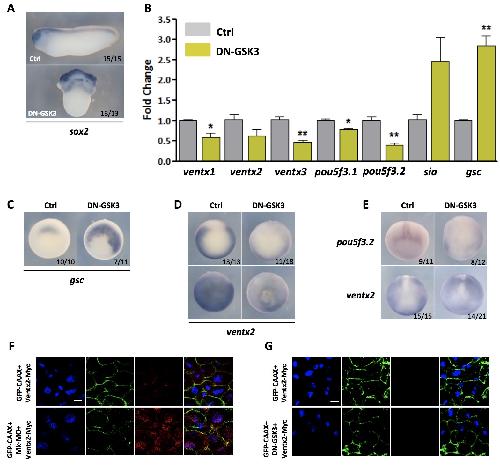 Supplementary file 1. GSK3 is not a negative regulator of the pluripotency gene network and is not required for MEK1-dependent Ventx2 clearance in vivo. (A). 4-cell embryos were injected with 300pg DN-GSK3 RNA per blastomere. Embryos were collected at stage 25 and processed for WISH analysis with sox2 probe. DN-GSK3 efficiently induced secondary body axes, indicating that the dose used was funcQonal. (B). Embryos injected as in (A), were collected at stage 10.5 and processed for RT-qPCR. (C-D). Embryos injected as in (A) were processed for WISH analysis at early gastrula stage 10.5 with gsc (C, vegetal view) and ventx2 (D, top: vegetal view, boZom: animal view) probes. (E). Embryos injected at the 8-cell stage with 300pg DN- GSK3 RNA in one dorsal animal blastomere were processed for WISH analysis at late gastrula stage 13 with pou5f3.2 and ventx2 probes (anterior view). (F-G). 4-cell embryos were injected in each cell with 50pg GFP-CAAX, 50pg Ventx2- Myc, and 25ng Mk-MO (F), or 50pg GFP-CAAX, 50pg Ventx2-Myc and 300pg of DN-GSK3 (G). Animal caps were explanted at blastula stage 9 and cultured unQl gastrula stage 11, fixed and processed for anQ-Myc (red), and anQ-GFP (green) immunostaining, and DNA was stained with DAPI (blue). Note that Ventx2-Myc is detectable only in MEK1 depleted caps. For the qPCR graph, error bars represent s.e.m. values of three independent experiments with two technical duplicates. For staQsQcal analyses, samples were compared with the respecQve control by Unpaired Studentâs t-test. *P< 0.05, **P< 0.005. In C, D and E, the number of embryos exemplified by the photograph over the total number of embryos analyzed is indicated. In F and G scale bar is 20 μm. |