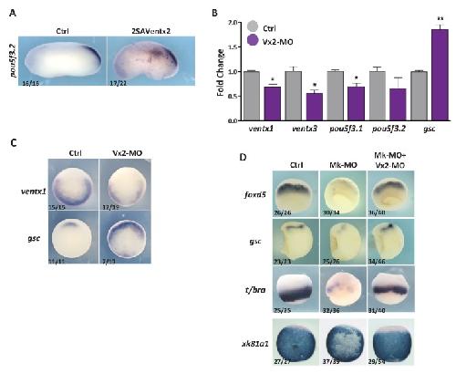 Figure 4âfigure supplement 1 Ventx2 knockdown restores germ-layer formation in MEK1-deficient embryos. (A) Four-cell embryos were injected with 50 pg 2SAVentx2-Myc RNA per cell, fixed at tailbud stage 25 and processed for WISH with pou5f3.2 probe. (B) Four-cell embryos were injected with 30 ng Ventx2-MO (Vx2-MO) per blastomere, collected at stage 10.5 and processed for RT-qPCR. (C) Embryos injected as in B were processed for WISH analysis at early gastrula stage 10.5 with ventx1 and gsc probes (vegetal view). (D). Four-cell embryos were injected with 25 ng Mk-MO, with or without 7.5 ng Vx2-MO, in each blastomere, collected at gastrula stage 10.5, and processed for WISH with indicated probes. Note that embryos stained for xk81a1 (epidermis) were injected in one ventral animal blastomere at 16 cell stage and collected at late gastrula stage 13. Embryos stained for gsc were hemisectioned prior to staining to improve probe penetration. In A and D, the number of embryos exemplified by the photograph over the total number of embryos analyzed is indicated. For the RT-qPCR graph, error bars represent s.e.m. values of three independent experiments with two technical duplicates. For statistical analysis, samples from injected embryos were compared with samples from uninjected control embryos by Unpaired Studentâs t-test. *p<0.05, **p<0.005, ***p<0.0001. |