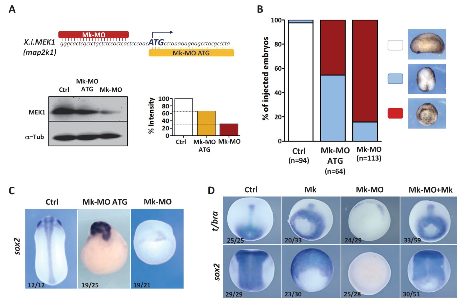 Figure 1. MEK1 depletion impairs embryonic development.(A) Mk-MO and Mk-MO ATG were designed to target MEK1 translation. Western blot analysis of blastula stage nine embryos injected with 25 ng per blastomere of either MO at the 4 cell stage revealed reduced MEK1 translation. α-Tubulin was used as a loading control. Control embryos were uninjected. The histogram shows the normalized intensity of MEK1 signals relative to control. (B) Embryos were injected as in (A) and morphology was analyzed at tailbud stage. (C) Embryos injected as in (A) were stained with Sox2 probe to highlight defective axis formation and neural tissue differentiation. (D) Embryos were injected at the 2 cell stage with 25 ng Mk-MO per cell, and at the 4- cell stage with 400 pg of mammalian MEK1 (Mk) RNA per cell and processed for WISH analysis at late gastrula stage 13 with t/bra probe to highlight the mesoderm (dorso-vegetal view) and with sox2 to highlight the neurectoderm (dorsal view). In C and D, the number of embryos exemplified by the photograph over the total number of embryos analyzed is indicated.DOI: http://dx.doi.org/10.7554/eLife.21526.002Figure 1âfigure supplement 1. MEK1 depletion by morpholinos.(A) Four-cell embryos were injected in each blastomere with 50 pg GFPâCAAX mRNA with or without 25 ng Mk-MO, fixed at blastula stage 9, cryosectioned and stained with anti-phospho-MEK1 antibody. The pMEK1 signal was severely reduced or lost in cells injected with Mk-MO. (B) Four-cell embryos were injected in each cell with 25 ng Mk-MO, collected at early gastrula stage 10.5 and processed for RT-qPCR to quantify p53 expression levels. MkâMO did not induce p53 expression. (C) Two-cell embryos were injected twice with 25 ng Mk-MO in each blastomere, followed by injection at 4 cell stage of hamster MEK1 mRNA (Mk; 400 pg per blastomere). In order to score progress through gastrulation pictures were taken from live stage 13 gastrula embryos (vegetal view). (D) Blastopore closure was scored by calculating the ratio of blastopore diameter of injected embryos to the mean of blastopore diameter of uninjected control embryos. Bars represent maximum and minimum values, and lines represent the mean. The number of embryos analyzed in each condition is displayed on the graph. For statistical analysis, samples were compared by Mann-Whitney test (99% confidence intervals were applied; ***pâ¤0.0001).DOI: http://dx.doi.org/10.7554/eLife.21526.00310.7554/eLife.21526.004Figure 1âfigure supplement 1âsource data 1. Values of blastopore closure ratios.Details are shown in Figure 1âfigure supplement 1 and Materials and methods.DOI: http://dx.doi.org/10.7554/eLife.21526.004 |
