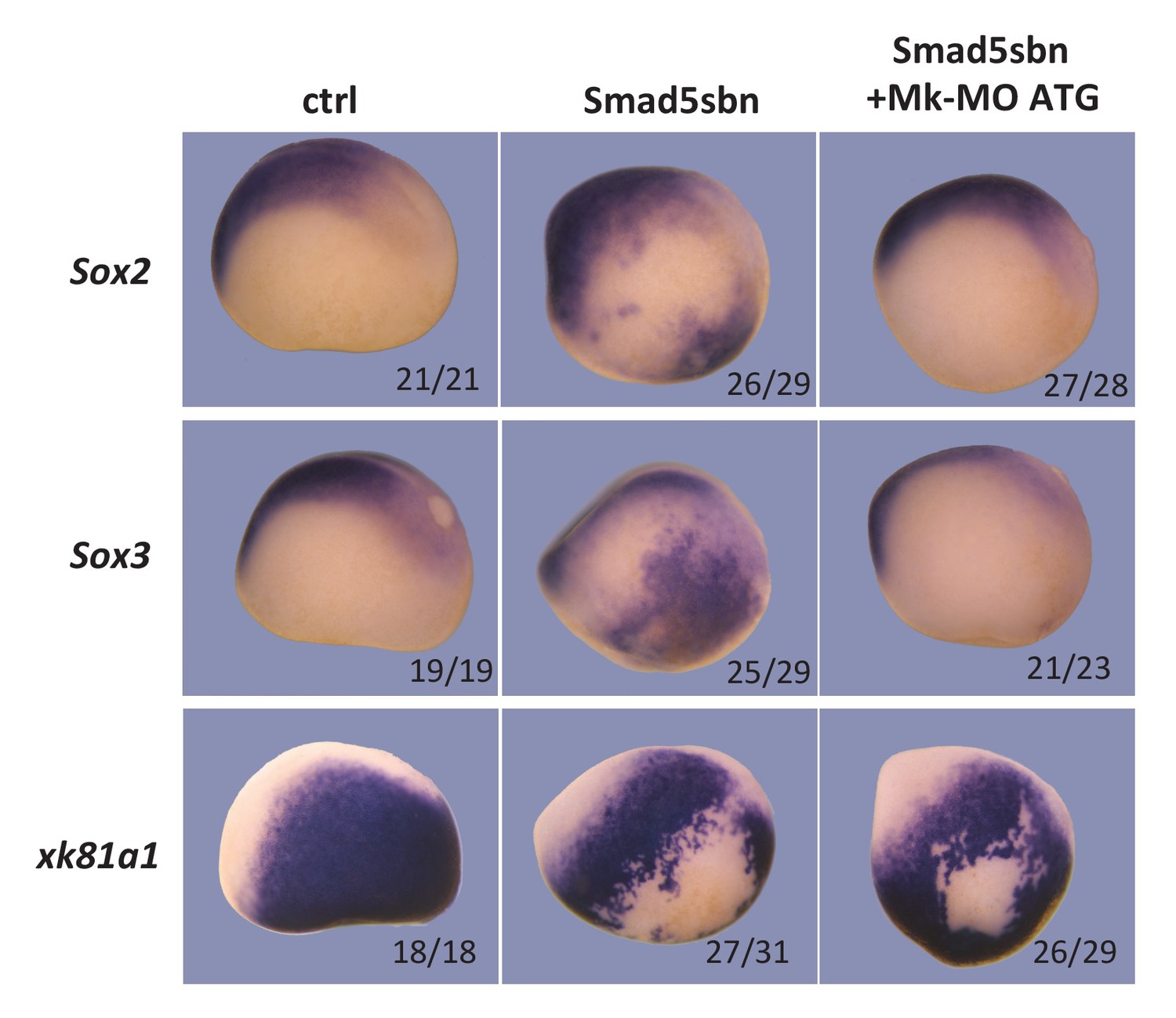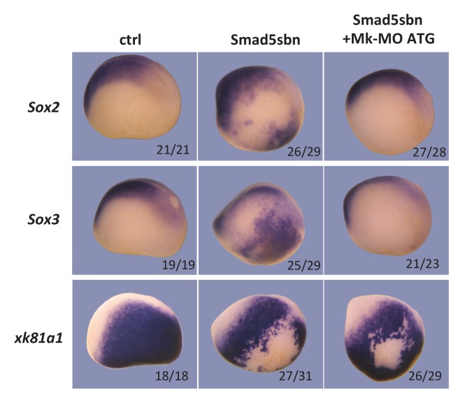 Figure 2âfigure supplement 1 Sixteen-cell embryos were injected in one ventral-animal blastomere with 3 ng of dominant-negative Smad5 (Smad5sbn) mRNA and 25 ng Mk-MO ATG, as indicated. Embryos were fixed at late gastrula stage 13, and processed for WISH with the indicated probes. The number of embryos exemplified by the photograph over the total number of embryos analyzed is indicated. Lateral views. |