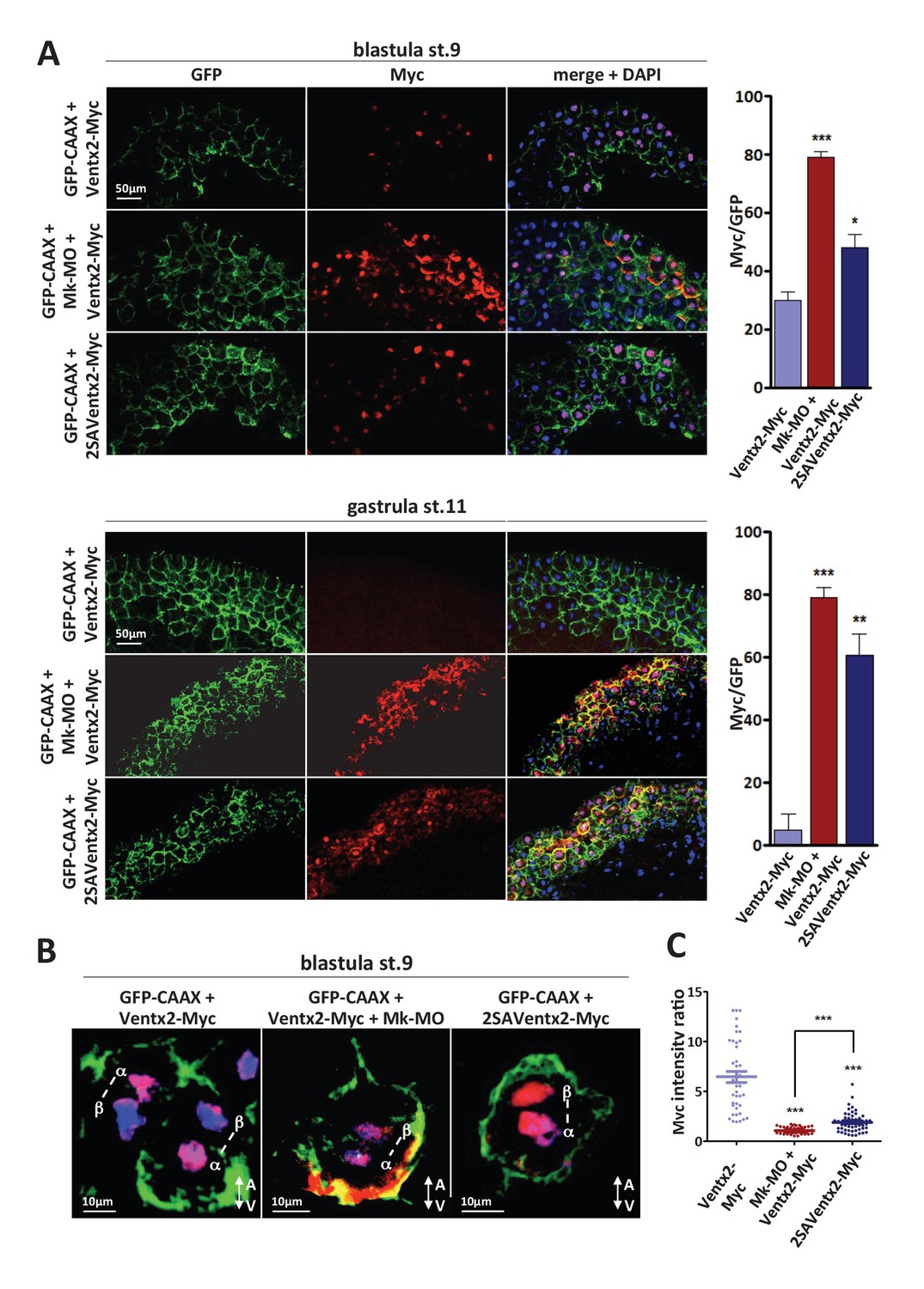 Figure 3 MEK1 is required for Ventx2 clearance and asymmetric distribution during cell division. (A,B) Four-cell embryos were injected in each cell with 50 pg GFP-CAAX, 50 pg Ventx2-Myc, 50 pg 2SAVentx2-Myc RNAs, and 25 ng Mk-MO, as indicated. Embryos were fixed at blastula stage 9, or gastrula stage 11, cryosectioned and processed for anti-Myc (red), and anti-GFP (green) immunostaining, and DNA was stained with DAPI (blue). Graphs show the percentage of Myc positive nuclei (DAPI positive) over the total number of injected cells (GFP positive) from four independent experiments. (B) 3D reconstruction of confocal slices of mitotic Myc positive nuclei labeled by DAPI from stage nine sectioned embryos. Sister mitotic chromosomes are referred to as α (more intense Myc staining), and β (less intense Myc staining). The A-V arrows indicate the animal-vegetal axis. Note the asymmetric cortical Ventx2-Myc signal in the MEK1 morphant cell. (C). The graph shows the ratios of Myc signal intensity betweenα and β sister nuclei. |