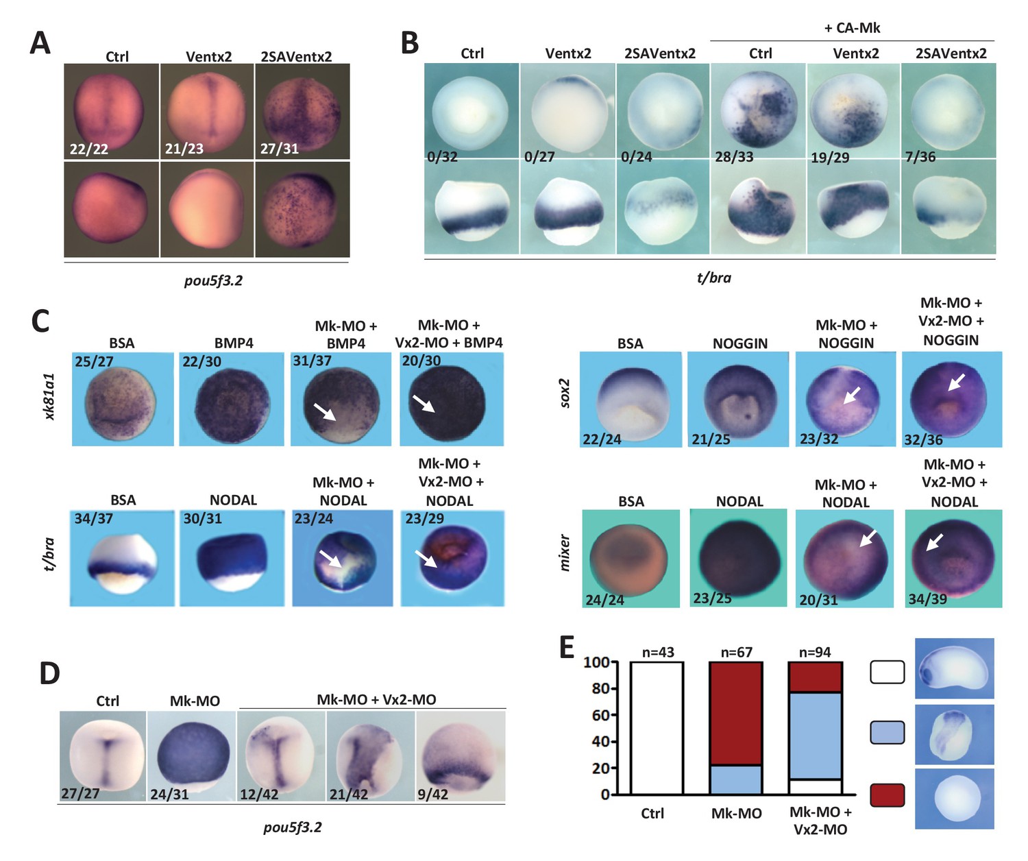 Figure 4. Ventx2 knockdown rescues the competence of MEK1-deficient cells to differentiate. (A) 4 cell embryos were injected in each cell with 50 pg Ventx2-Myc or 50 pg 2SAVentx2-Myc RNAs, and processed for WISH analysis at late gastrula stage 13 with pou5f3.2 probe. Stabilized 2SAVentx2 maintains ectopic pou5f3.2 expression. Top row dorsal view, bottom row lateral view. (B) Embryos injected as in (A), with or without 500 pg CA-Mk RNA per blastomere, were processed for WISH analysis at early gastrula stage 10.5 with t/bra probe. The number of embryos with ectopic t/bra expression is indicated in each condition. Stabilized 2SAVentx2 counteracts CA-Mk activity. Top row animal view, bottom row lateral view. (C) Sixteen-cell embryos were injected in one animal blastomere with 50 pg GFP-CAAX RNA, 25 ng Mk-MO and 7.5 ng Vx2-MO, as indicated. Next, these embryos were injected at blastula stage 8.5 with recombinant BMP4 (2 ng for xk81a1 induction, animal view), NODAL (5 ng for t/bra induction, lateral view; 50 ng for mixer (endoderm) induction, animal view), or NOGGIN (36 ng for sox2 induction, animal view) proteins into the blastocoel, collected at early gastrula stage 10.5, and processed for WISH. Mk-MO injected domains are indicated by white arrows. (D) Four-cell embryos were injected in each blastomere with 25 ng Mk-MO alone or with 7.5 ng Vx2-MO, collected at late gastrula stage 13 and processed for WISH with pou5f3.2 probe. (E) Embryos injected as in (D) were collected at tailbud stage 25, processed for WISH with sox2 probe, and scored. Ventx2 knockdown partially restores development of MEK1-deficient embryos. MEK1/Ventx2 double knockdown rescue assays were repeated five times. In A and C, the number of embryos exemplified by the photograph over the total number of embryos analyzed is indicated. |