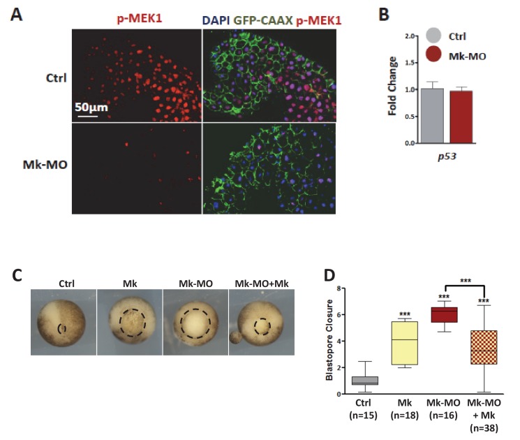 SF1.2 MEK1 depletion by morpholinos. (A) Four-cell embryos were injected in each blastomere with 50 pg GFPâCAAX mRNA with or without 25 ng Mk-MO, fixed at blastula stage 9, cryosectioned and stained with anti-phospho-MEK1 antibody. The pMEK1 signal was severely reduced or lost in cells injected with Mk-MO. (B) Four-cell embryos were injected in each cell with 25 ng Mk-MO, collected at early gastrula stage 10.5 and processed for RT-qPCR to quantify p53 expression levels. MkâMO did not induce p53 expression. (C) Two-cell embryos were injected twice with 25 ng Mk-MO in each blastomere, followed by injection at 4 cell stage of hamster MEK1 mRNA (Mk; 400 pg per blastomere). In order to score progress through gastrulation pictures were taken from live stage 13 gastrula embryos (vegetal view). (D) Blastopore closure was scored by calculating the ratio of blastopore diameter of injected embryos to the mean of blastopore diameter of uninjected control embryos. Bars represent maximum and minimum values, and lines represent the mean. The number of embryos analyzed in each condition is displayed on the graph. For statistical analysis, samples were compared by Mann-Whitney test (99% confidence intervals were applied; ***pâ¤0.0001). |