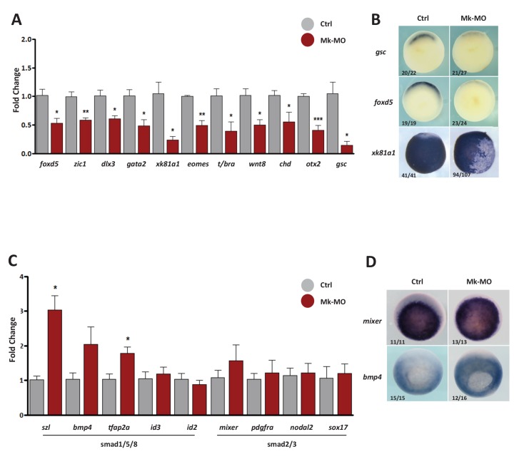 SF1.1 Gene expression analysis of MEK1-depleted gastrula embryos. (AâD) Four-cell embryos were injected in each blastomere with 25 ng Mk-MO, collected at early gastrula stage 10.5 and processed for RT-qPCR to quantify changes in the expression levels of pro-differentiation markers (A), or changes in the expression levels of BMPs (Smad1/5/8) and Activin/Nodal (Smad2/3) signaling targets (C). For all qPCR graphs, error bars represent s.e.m. values of four independent experiments with two technical duplicates. For statistical analyses, samples from injected embryos were compared with samples from uninjected control embryos by Unpaired Studentâs t-test. *p<0.05, **p<0.005, ***p<0.0001. (B,D) Some embryos from the same experiment were processed for WISH with the indicated probes. Note that embryos stained for xk81a1 (epidermis) were injected with 25 ng Mk-MO in one ventral animal blastomere at 16-cell stage and collected at late gastrula stage 13. In B and D, the number of embryos exemplified by the photograph over the total number of embryos analyzed is indicated. |