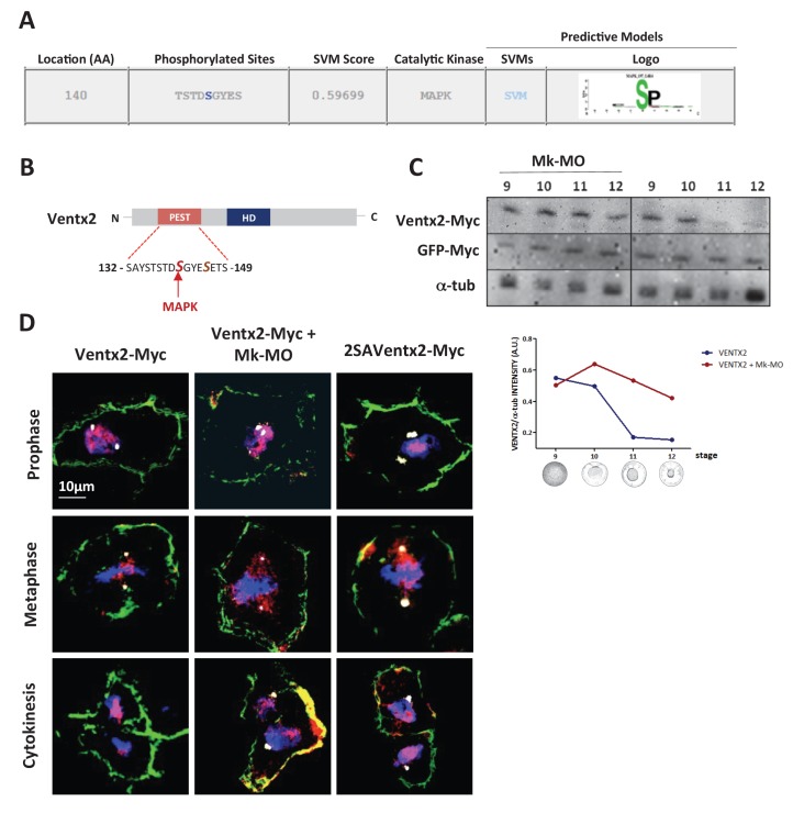 Figure 3âfigure supplement 1 Ventx2 degradation and asymmetric distribution require MEK1 activity. (A) In silico analysis of phosphorylation sites in the Ventx2 protein and prediction of kinases involved, with Kinasephos2 software. (B) Schematic representation of the Ventx2 protein. HD indicates the homeodomain (blue box), and the PEST destruction motif is highlighted in red. Note that Serine 140, which is required for Ventx2 degradation, is a predicted target of MAPK. (C) 50 pg Ventx2-Myc RNA was injected into both blastomeres at the two-cell stage. 50 pg GFP-Myc-RNA was co-injected as an internal loading control. Embryos were allowed to develop until the indicated stages, and exogenous Ventx2 was detected by anti-Myc immunostaining on Western blot. The graph shows the ratios of Ventx2-Myc over a-tub signals measured from the Western blot. (D) Four-cell embryos were injected in each cell with 50 pg GFP-CAAX, 50 pg Ventx2-Myc, 50 pg 2SAVentx2-Myc RNAs and with 25 ng Mk-MO as indicated. Embryos were fixed at blastula stage 9, cryosectioned and processed for anti-Myc (red), anti-GFP (green) and anti-g-tubulin (centrosomes, white) immunostaining, and DNA was stained with DAPI (blue). Panels represent compiled confocal slices to visualize entire mitotic nuclei. |