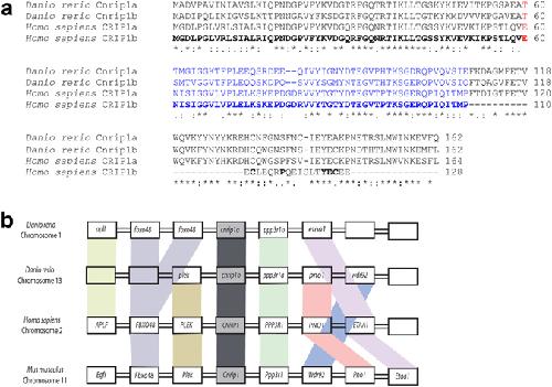 Figure 1. Cnrip1 genes in zebrafish. (a) Amino acid sequence alignment of Cnrip1a and Cnrip1b with the two splice variants of the single human CNRIP1 gene, named CRIP1a and CRIP1b. Distinct exons are shown in alternating black and blue font (red indicates amino acids coded by two exons). Comparing both zebrafish genes and CRIP1a asterisk indicates identity and colon similarity between all three, full stop similarity between any two. Bold indicates identity between CRIP1a and CRIP1b. (b) Synteny of adjacent genes in vertebrate CNRIP1 loci. Colours link homologous genes.