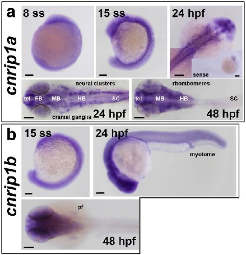 Figure 2. Accumulation of mRNAs from cnrip1a and cnrip1b genes. Whole mount in situ mRNA hybridisation of embryos at the indicated stages for antisense probes to cnrip1a (a) and cnrip1b (b). Lateral views (first two images in each panel) are anterior to top dorsal to left, except 24 hpf in which anterior is to left and dorsal to top. Dorsal views (remaining images) are anterior to left flatmounts (a) or wholemount (b), except panel a top right, which is a wholemount montage with anterior to top right. Sense control in inset in panel a top right is anterior to right dorsal to bottom. Quantitative evidence of reproducibility is given in Table S1. tel telencephalon, FB forebrain, MB midbrain, HB hindbrain, SC spinal cord, pf pectoral fin. Bars = 100 µm.