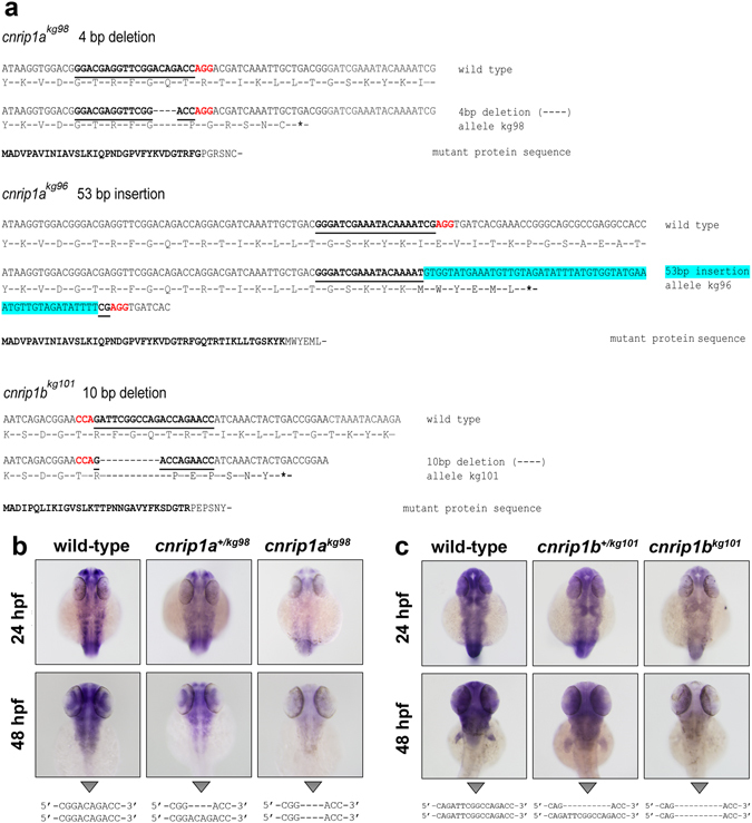 Figure 3. Mutagenesis of cnrip1a and cnrip1b. (a) Alignments of wild type with each of three mutant alleles showing the predicted expressed mutant polypeptide beneath. Bold underline indicates the gRNA target, red font the protospacer motif recognised by Cas9, hyphens deleted bases, blue highlight inserted bases and asterisks novel stop codons. In the mutant protein sequences, bold text indicates the residual wild type fragment and normal font the aberrant polypeptide tail. (b,c). To test for nonsense-mediated decay, about 50 siblings from in-crosses of cnrip1a