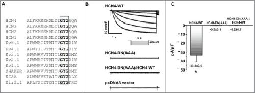 Figure 2. HCN4 dominant-negative effect test in HEK293 cells. (A) Sequence alignment of mouse HCN channels and other K+ channel examples that have a signature cation selectivity “GYG” motif at the channel pore region. (B) IHCN currents were elicited by a stepwise hyperpolarization to −120 mV from a holding potential of −40 mV; and then normalized to membrane capacitance. Representative IHCN4 current traces recorded in HEK293 cells expressing HCN4-WT, HCN4-DN(AAA) mutant, both HCN4-DN(AAA)/HCN4-WT, or a vector control are shown. Transfection with HCN4-WT produced robust IHCN4 currents, whereas transfection with HCN4-DN(AAA) did not produce any current greater than the vector control. When HCN4-WT and HCN4-DN(AAA) were co-transfected, IHCN4 was abolished. (C) Summary data for the peak IHCN4 currents recorded from HEK293 cells expressing WT-HCN4, HCN4-AAA mutant, HCN4-AAA/WT-HCN4 or vector control, confirming the ability of HCN4-DN(AAA) to act as a dominant-negative construct. n = 4–5, *p < 0.05. |