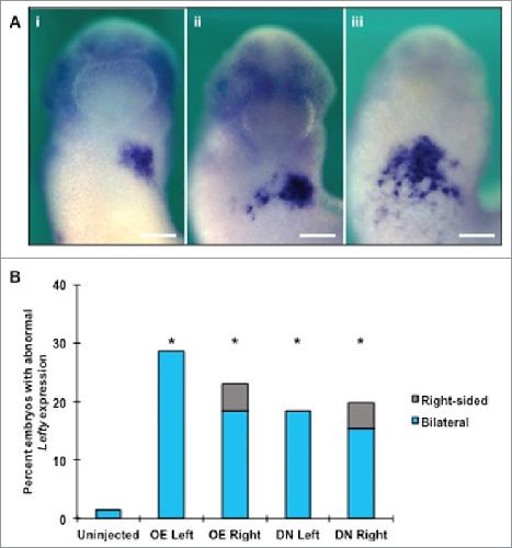 Figure 7. Altering normal HCN4 expression results in aberrant Lefty expression. (A) As visualized via in situ hybridization analysis, Lefty is normally expressed unilaterally in the left lateral plate mesoderm in NF stage 27 embryos (i). Altering HCN4 expression induced both full or partial bilateral and abnormal Lefty expression but did not result in a complete reversal of expression (solely right-sided). One of the most frequently observed bilateral phenotypes was a partial secondary field on the right side of embryos with the midline maintained by an absence of Lefty expression (ii). In the other commonly seen phenotype, Lefty transcripts were expressed across the anterior ventral surface of animals in an undefined shape with no visible midline gap (iii). Images are ventral views with anterior at top. (B) Overexpressing HCN4 and HCN4-DN(AAA) injection led to significant percentages of abnormal embryos compared with uninjected embryos (Ï2 = 19.0086, df = 4, *p < 0.05). There was no statistical difference between overexpression and dominant-negative phenotypes. n = 56â71 embryos per condition across 3 biological replicatesOE = HCN4-OE, DN = HCN4-DN(AAA). Scale bars = 200 μm. |