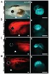 Figure 4. Inhibiting HCN4 function in different locations disrupts heart morphology. (A) Uninjected tadpoles have a clear chest cavity at NF stage 43/44, making the heart easily visible laterally (arrowhead, i). Hearts have normal ventricle and outflow tract morphology as seen via IHC for cardiac troponin-T antibody (ventral view, ii). The left eye is circled (white dashed line) in all images as a landmark. (B-D) HCN4-DN(AAA) injected embryos display a variety of heart defects, irrespective of the location of the lineage label membrane-bound RFP. Examples of tadpoles with mem-RFP located in the: heart (arrowhead, B, i), posterior flank (C, i), and dorsal region (D, i) of HCN4-DN(AAA) injected animals. White arrowheads denote position of heart. Ventral views of malformed heart phenotypes: symmetric midline hearts (B, ii), unlooped hearts (C, ii), and twisted hearts (D, ii). n = 18â31embryos per injection condition. Scale bars = 200 µm. |