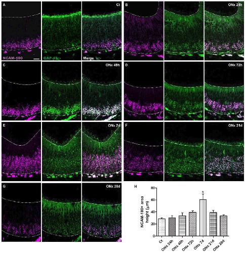 (G) post-axotomy, scale bar: 50 mm; (H) quantification of the NCAM-1801 area height in control