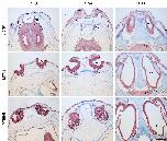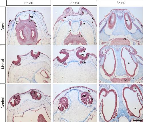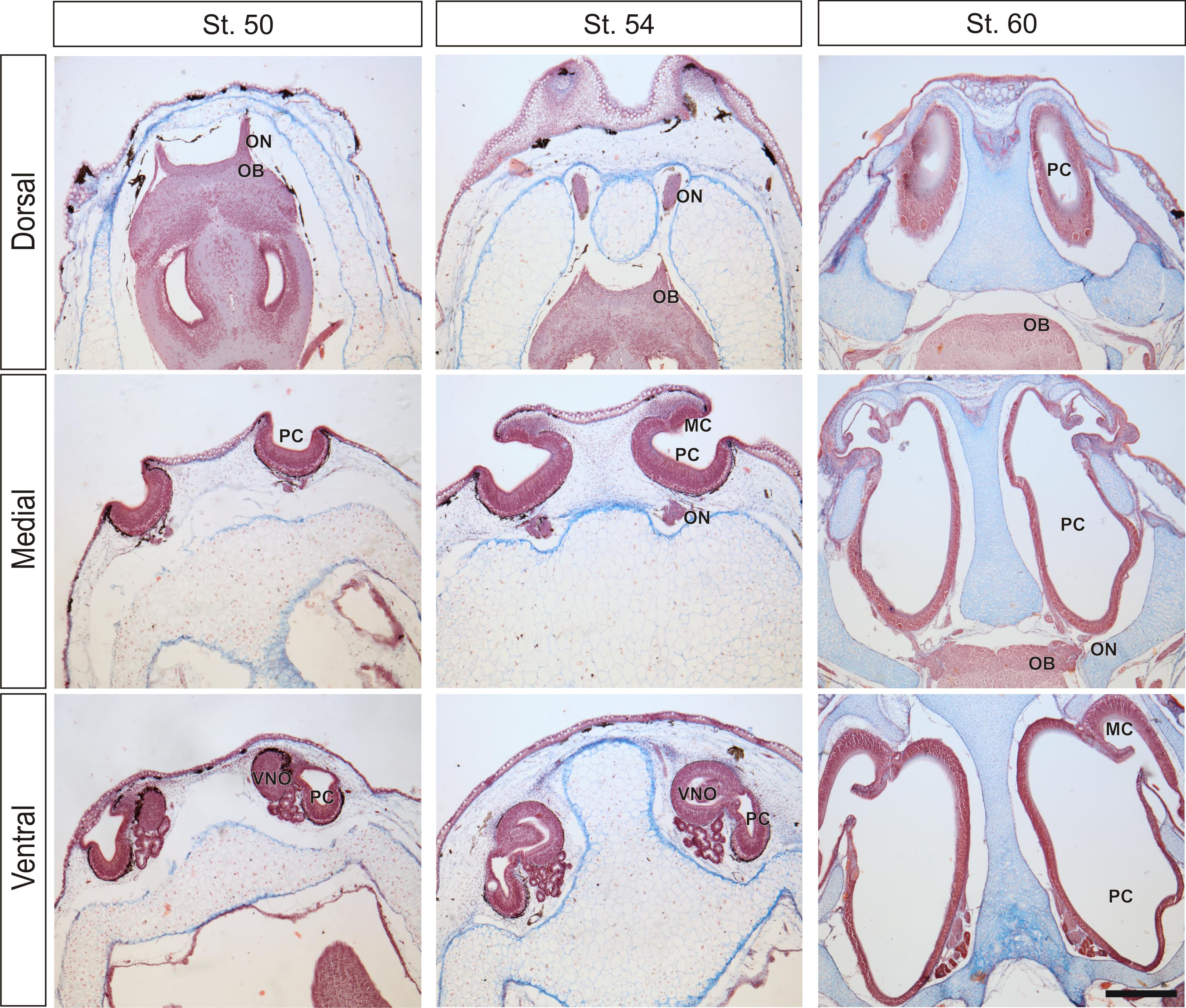 Fig. S3. Structure and organization of the olfactory system of X. laevis larvae. Longitudinal sections of X. laevis larvae at premetamorphosis (stage 50 and 54) and metamorphic climax (stage 60); the top row belongs to a more dorsal section, the middle row to a medial section and the lower row to a more ventral section; principal cavity (PC), middle cavity (MC), vomeronasal organ (VNO), olfactory nerve (ON), olfactory bulb (OB); staining: Masson–Goldner’s trichrome stain, scale bar: 100µm.