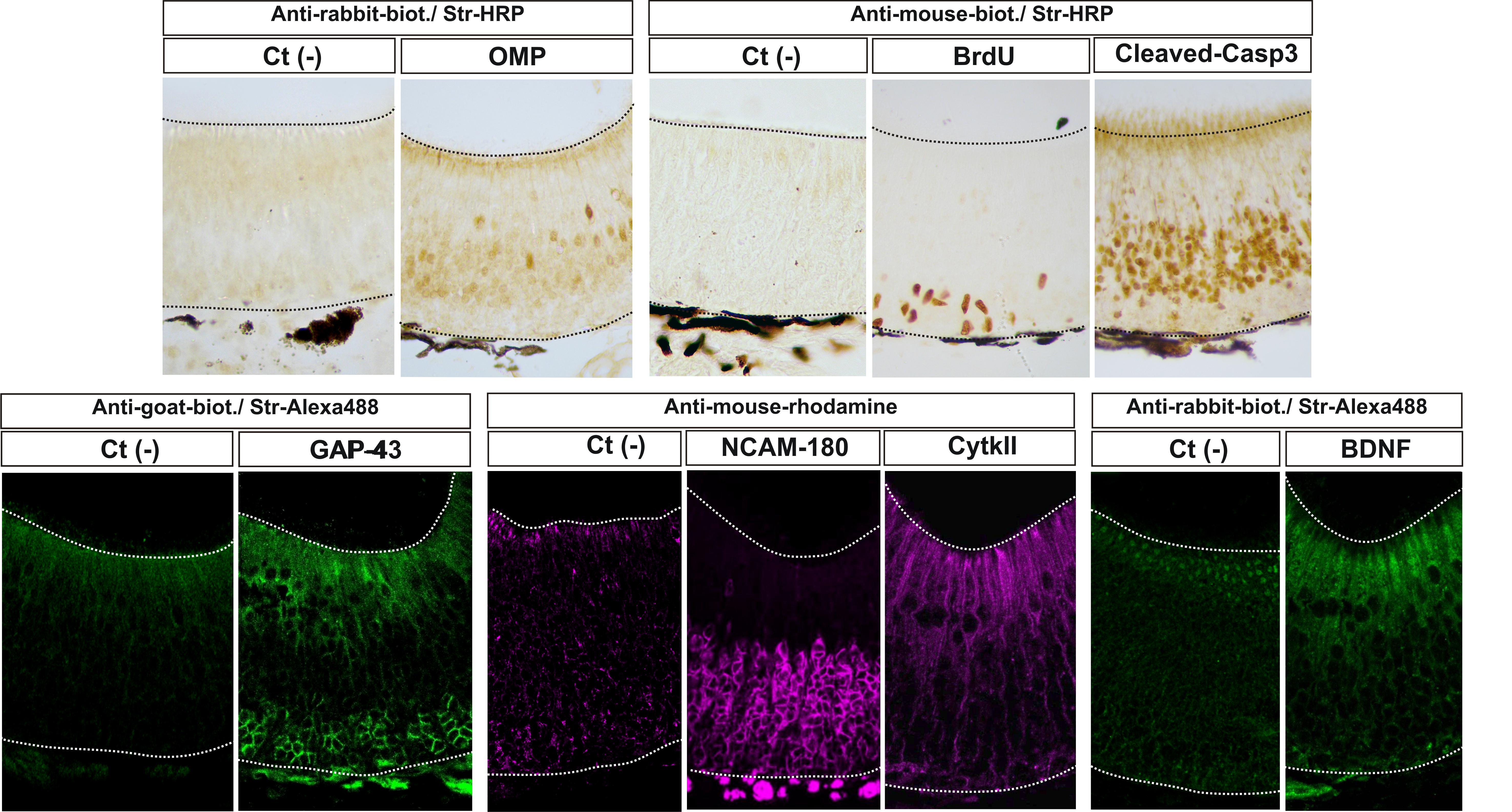Fig. S1. Negative controls for immunohistochemistry and immunofluorescence by omitting primary antibodies. Primary antibodies were omitted (Ct(-)) and no specific immunostaining is visible after incubation with the secondary antibodies biotinylated (biot.) coupled with streptavidin- horseradish peroxidase (Str- HRP) or coupled with a fluorophore (rhodamine or Alexa 488).