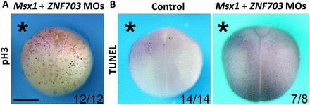 Little effect on cell proliferation (A) and apoptosis (B) of Xenopus embryos by the moderate double knockdown of Msx/vab-15 and ZNF703/tlp-1. pH3, phosphorylated histone H3Serine10 as a cell proliferation marker. TUNEL, apoptosis marker. Embryos are viewed from the dorsal side with anterior on top. Asterisks indicate the morpholino injection side. (Scale bar, 0.5 mm.)