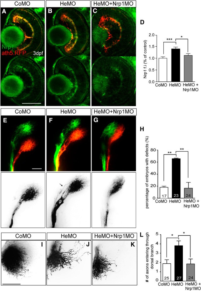 Figure 4. Restoring Nrp1 levels rescues the dorsal axon topography defect in Hermes-depleted embryos. Shown is Nrp1 immunostaining on retina transverse sections from atoh7:gapRFP zebrafish embryos injected with CoMO (A), HeMO (B), or HeMO+Nrp1MO (C). Quantifications show a significant increase of Nrp1 signal intensity in the HeMO condition compared with CoMO and HeMO + Nrp1MO (D). Lateral view of whole-mount DiI- and DiO-injected retina from CoMO- (E), HeMO- (F), and HeMO + Nrp1MO (G)-injected embryos. HeMO + Nrp1MO-coinjection showed a significant reduction of the percentage of embryos with mistargeting in the OT compared with HeMO (H). DiI-labelling of dorsal axons in the tectum of CoMO (I), HeMO (J), and HeMO + nrp1MO (K) injected embryos. Quantifications show a rescue of misprojecting dorsal axons in HeMO+nrp1MO injected embryos (L). Error bars indicate SEM. Numbers of embryos analyzed are indicated on bars. Scale bars: A–C, 100 μm; E–G, I–K, 50 μm).