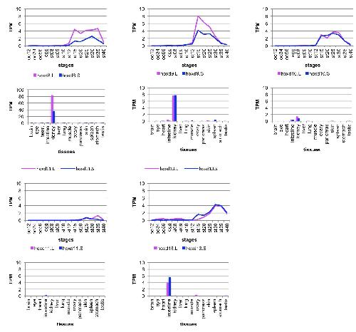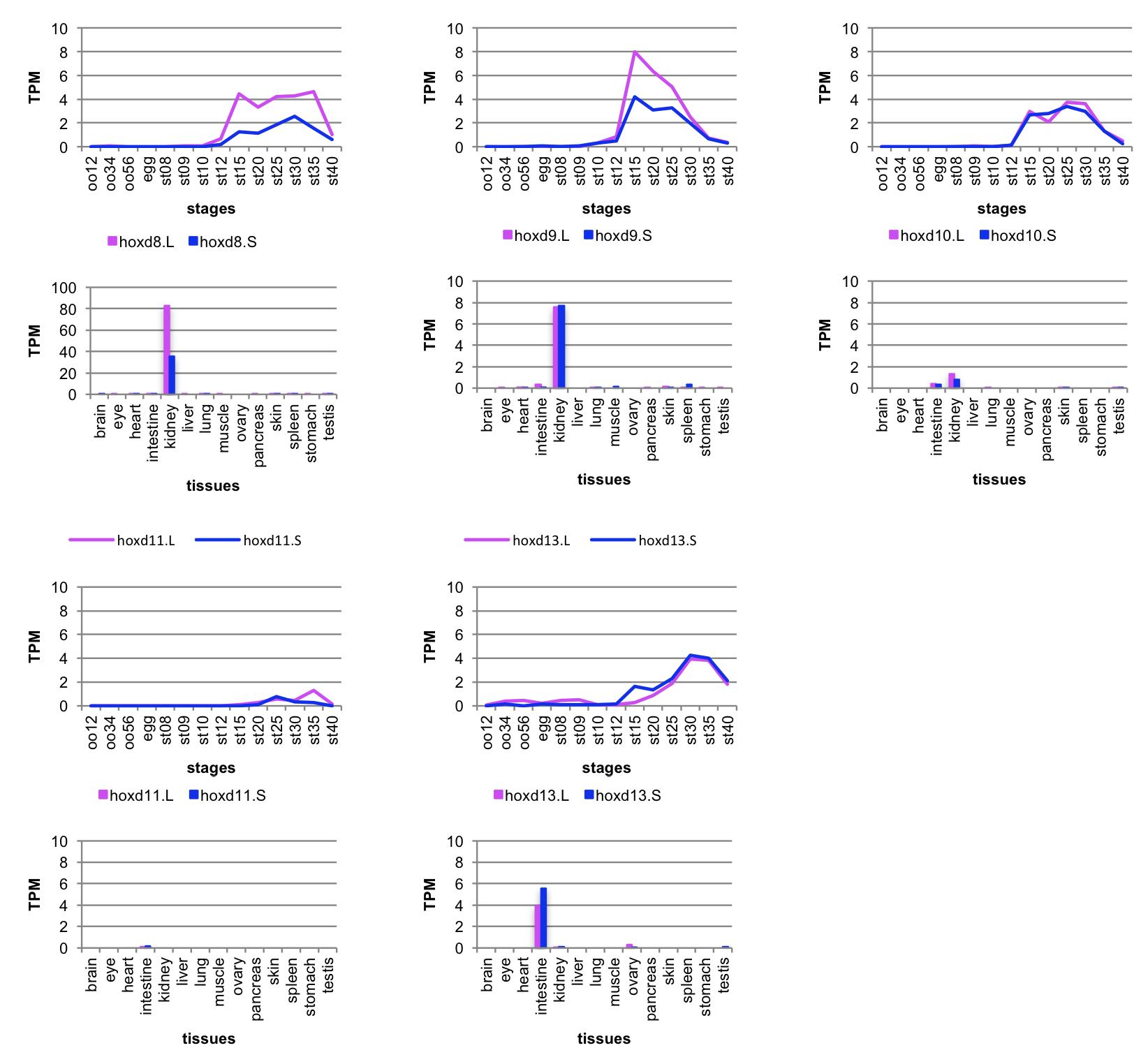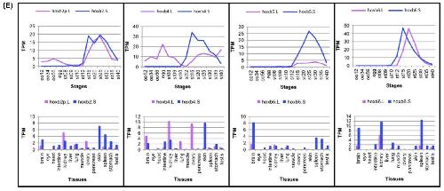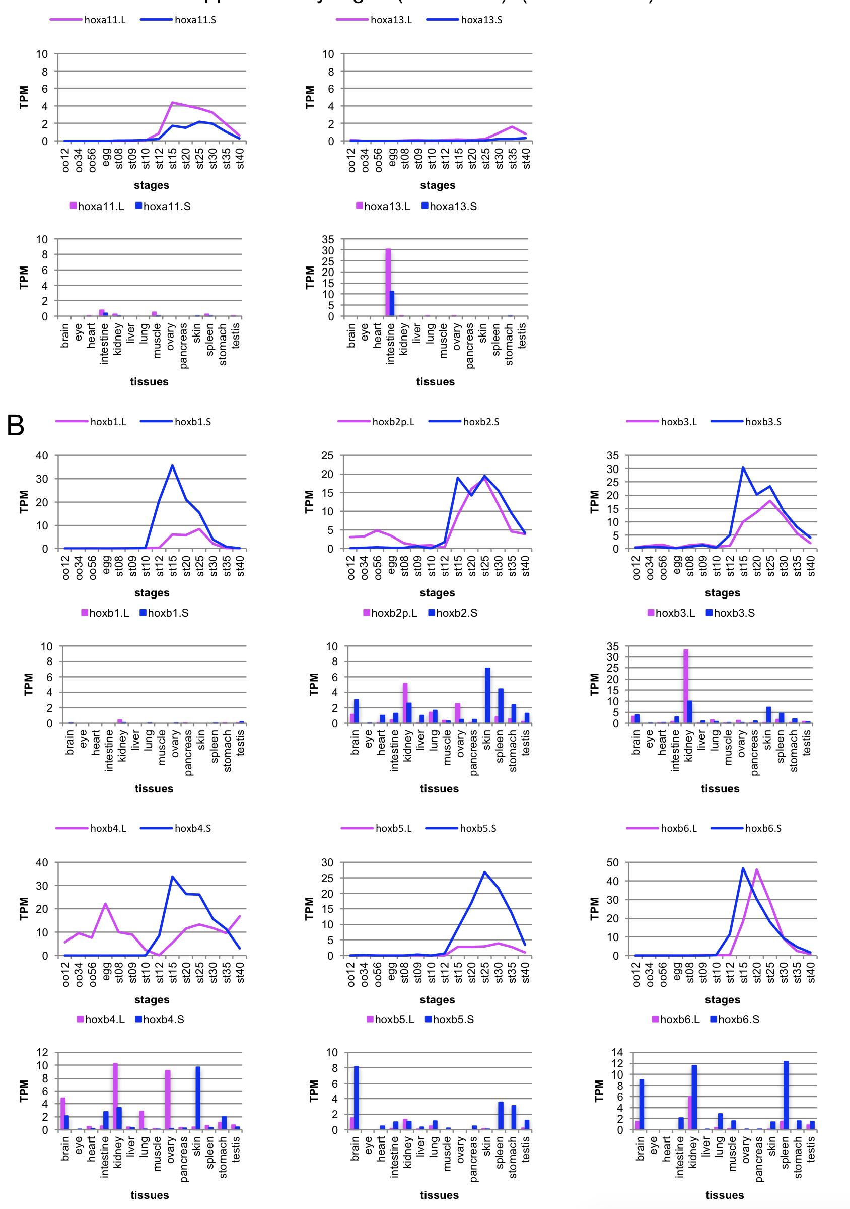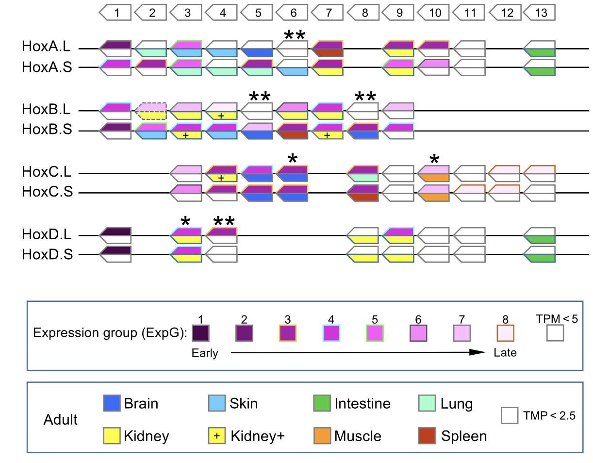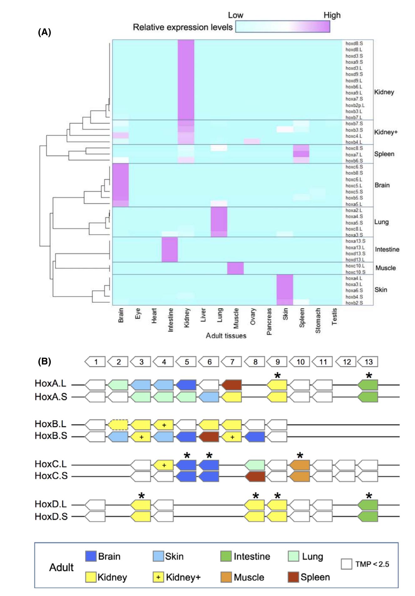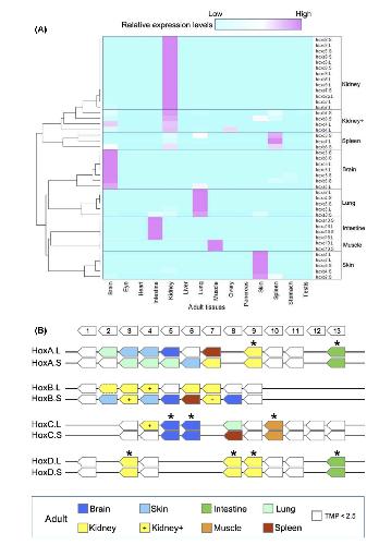Fig. 5. Expression of hox genes in adulttissues. (A) Expression levels of 43 genesthat had TPM more than 2.5 at somepoint were normalized so that the peakTPM is 1. By clustering analysis, thegenes were grouped into eight, dependingon the tissue(s) with the most expression.The genes in the “kidney+” group showedexpression in kidney and some other tis-sue, whereas the “kidney” group geneswere expressed exclusively in kidney. (B)Summary of expression profiles. Asterisksindicate homeologs that show a similarpattern of expression.