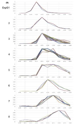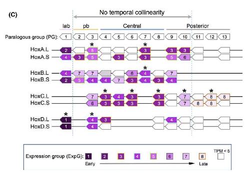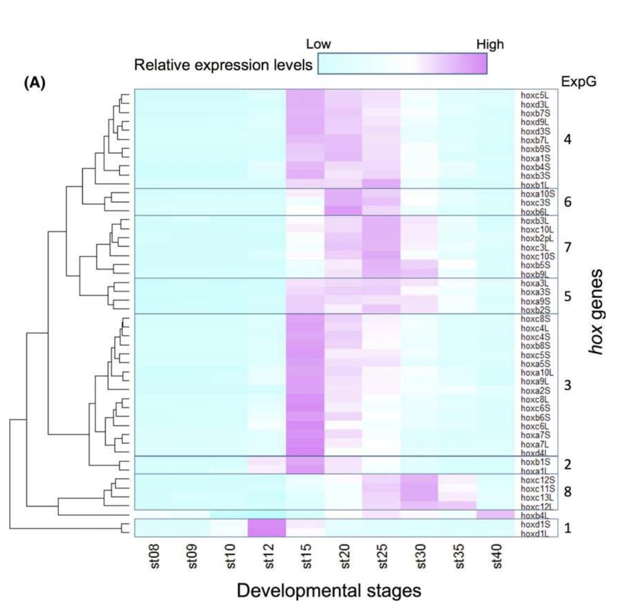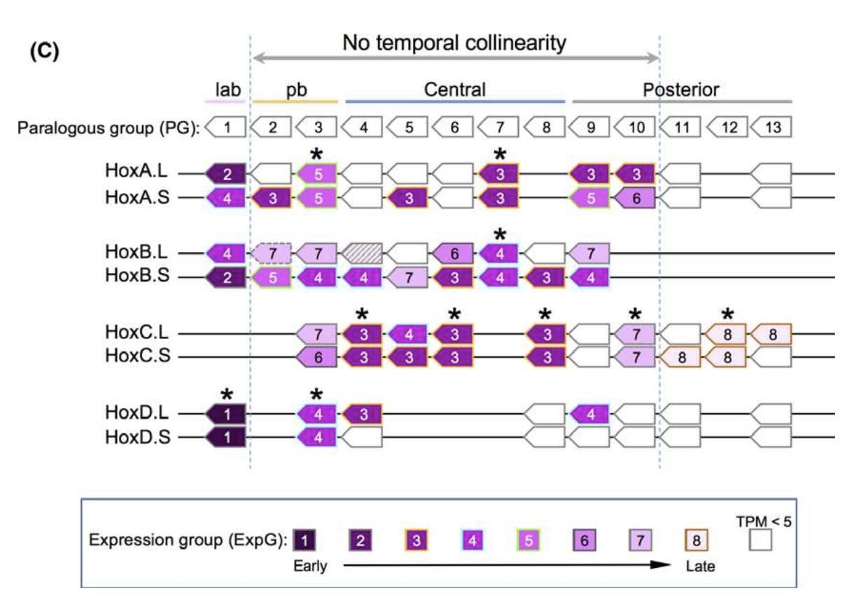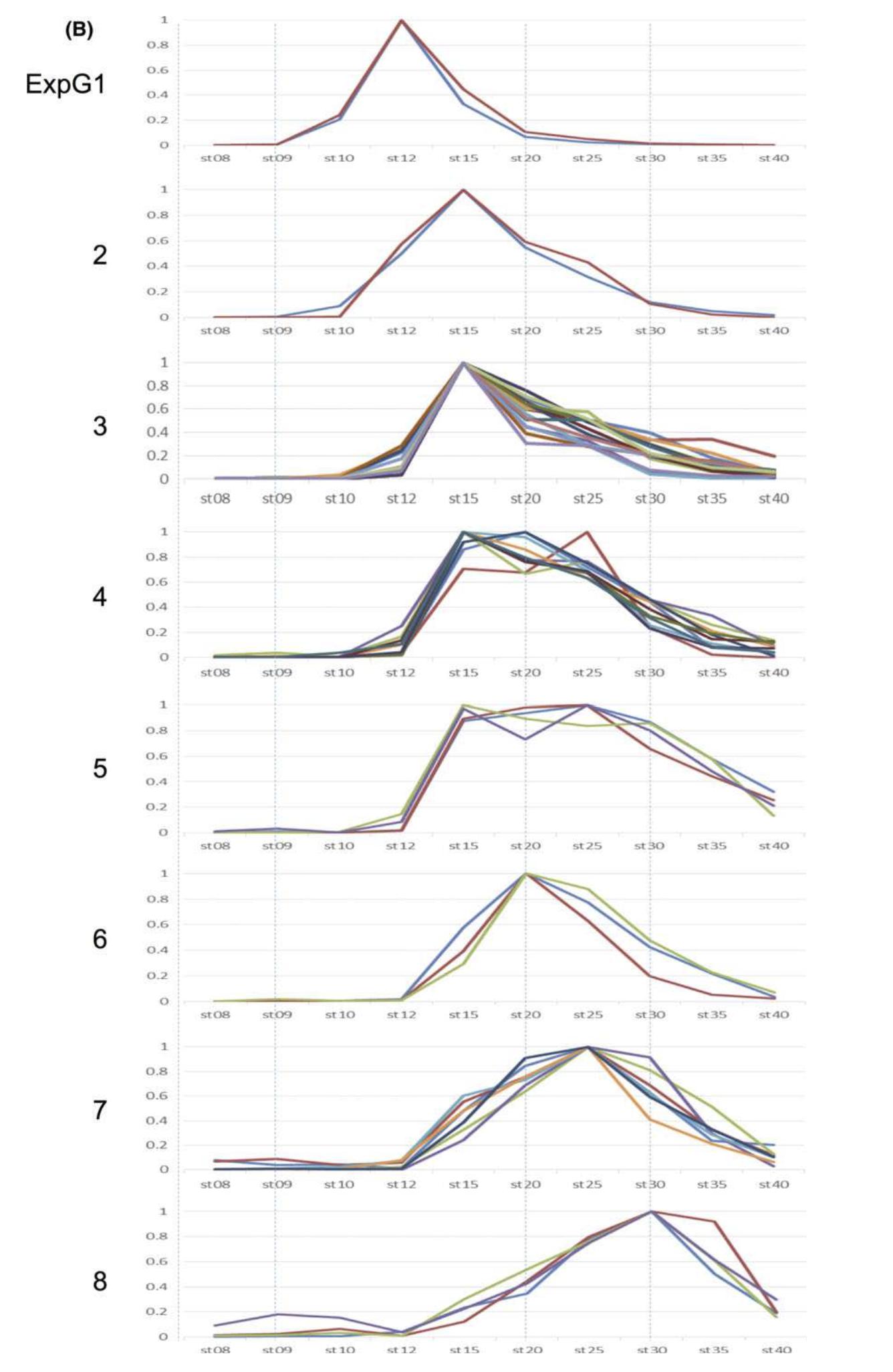 Fig. 4. Temporal expression of hox genes during developmental stages 8 to 40. (A) Expression levels of 50 genes that had TPM morethan 5.0 at some point was normalized so that the peak TPM is 1. By clustering analysis, genes were grouped into eight “expressiongroups” (ExpG). hoxb4.L was exceptional, since the egg showed the highest value, but to observe zygotic expression, it was normalizedto the value at stage 40. Nevertheless, because of its unique pattern, this was not included in any ExpG. (B) Expression profiles of eachExpG. The patterns are mostly overlapping. (C) Summary of expression profiles. Four of the six PG1 (labial) genes are categorized inExpG1 (the other two are ExpG4), and expressed early, and PG11 to 13 genes in the posterior group are expressed late (ExpG8) or notuntil after stage 40, whereas the pb, central, and posterior PGs 9 and 10 showed no temporal collinearity. Asterisks indicate homeologsthat belong to the same ExpG.