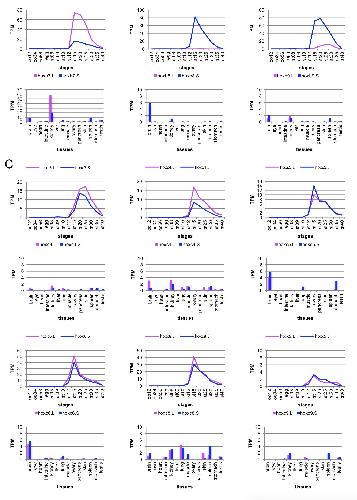 Fig. 6. Summary of expression profiles.Single asterisks indicate homeologs thatbelong to the same ExpG during develop-mental stages and show a similar patternof expression in adult tissues. Doubleasterisks indicate homeologs in which theexpression of one of the two is notdetected or is relatively low.