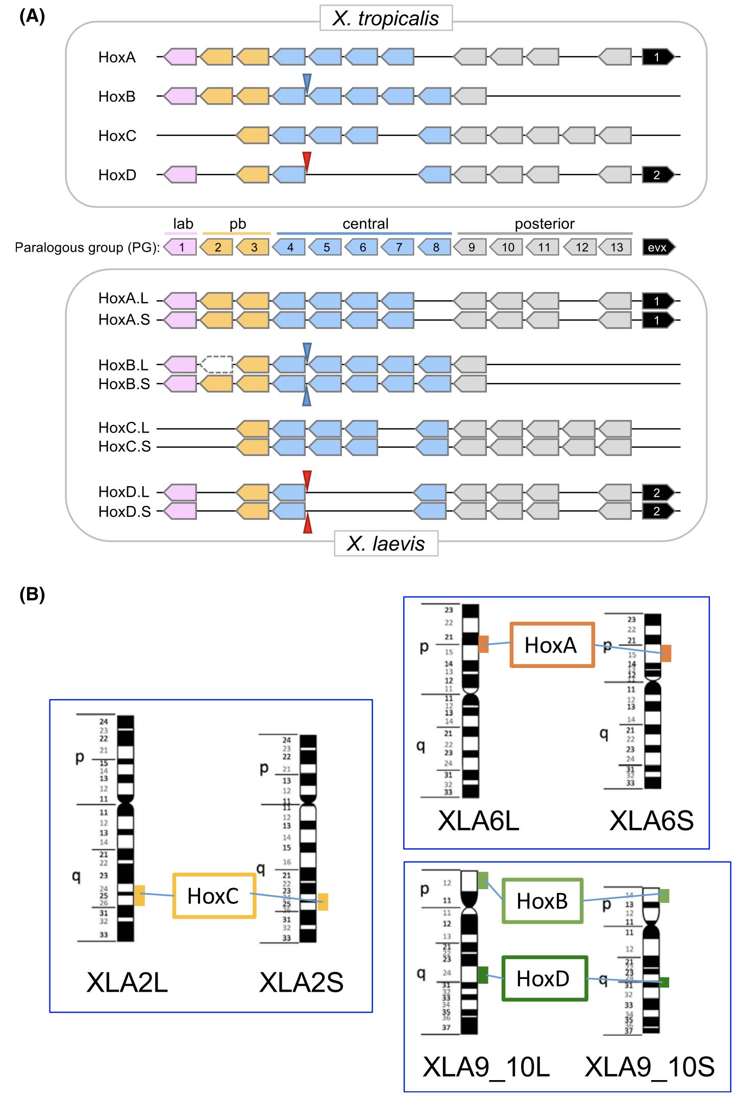 Fig. 1. The Hox clusters of Xenopus lae-vis and X. tropicalis. (A) Schematic repre-sentations of the four and eight Hoxclusters of X. tropicalis and X.laevis,respectively. hox genes of 13 paralogousgroups (PGs) are present. even-skippedhomeobox (evx) genes are present onHoxA and HoxD clusters. The four pairsof homeologous Hox clusters of X. laevisconsist of clusters from its two subge-nomes, and are designated as L and S.hoxb2p.L is a pseudogene (Session et al.2016). Positions of micro RNA genesmir10a (blue arrowheads) and mir10b (redarrowheads) are also shown. (B) Positionsof Hox clusters on X. laevis chromo-somes. Hox clusters are present on corre-sponding chromosomes of the twosubgenomes at corresponding positions.