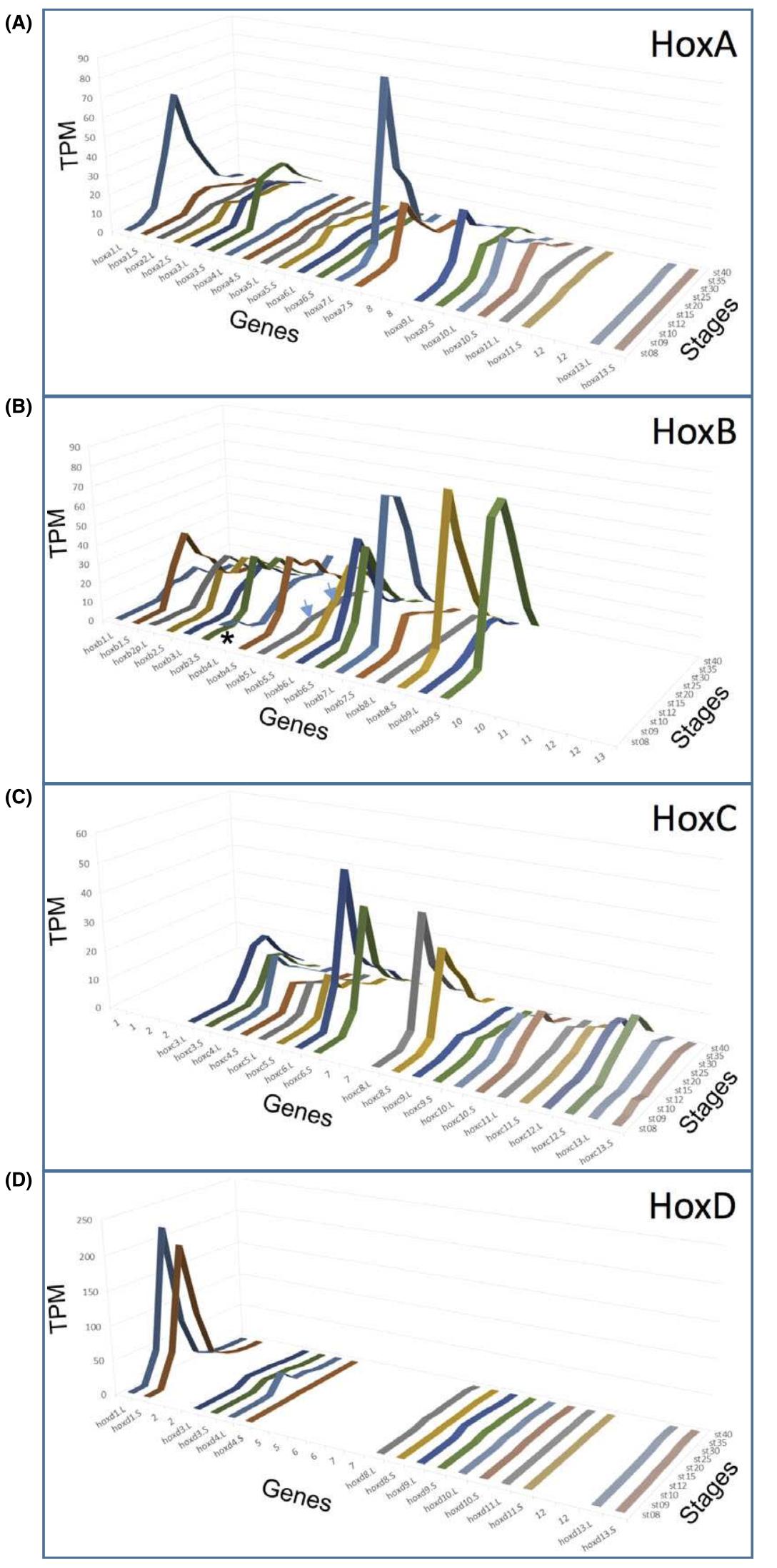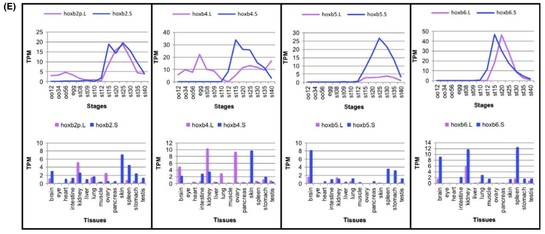 Fig. 2. Expression of hox genes. (A–D) The expression of all 76 hox genes from four pairs of Hox clusters in X. laevis was analysed byRNA-seq analyses during developmental stages (stage (st) 8–40). The average values of TPM from two clutches are plotted for eachgene. Only the PG number is indicated where there is no corresponding gene in that cluster. Between some homeologs, a large differ-ence in expression levels are observed (for example, hoxb5.L and hoxb5.S [arrows]). Note that hoxb4.L is expressed maternally (as-terisk). (E) Expression profiles during development and in adult tissues of hoxb2, hoxb4, hoxb5, and hoxb6 homeologs. Average TPMvalues are plotted. oo12: oocyte stages I and II; oo34: oocyte stages III and IV; oo56: oocyte stages V and VI; st: stage.
