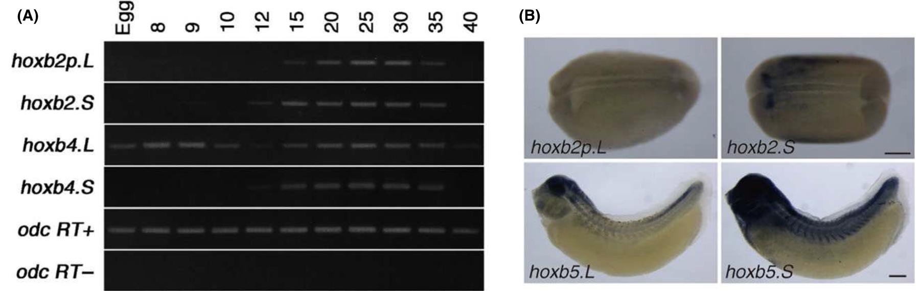 Fig. 3. Expression of hoxb2, hoxb4, and hoxb5 homeologs. (A) Expression analysis of hoxb2p.L, hoxb2.S, hoxb4.L, and hoxb4.S. RT-PCR using primers speciï¬c to each gene was performed against cDNA from eggs (egg) and stage 8â40 embryos. As controls, a house-keeping gene, odc, was ampliï¬ed using reverse-transcribed (RT+) or untreated (RT-) RNA as templates. (B) WISH analyses of hoxb2 andhoxb5 homeologs. Results for stage 20 (hoxb2 homeologs) and stage 31 (hoxb5 homeologs) are shown. The coloring reaction was per-formed for the same length of time to compare between homeologs.