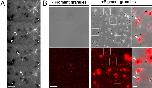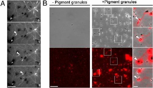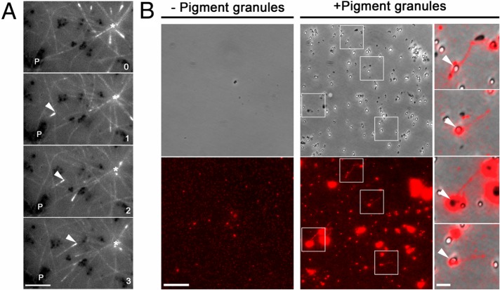 FIGURE 3:. Pigment granules nucleate MTs in vivo and in vitro. (A) Sequential live fluorescence images of the centrosome area of an EGFP-EB1–expressing melanophore injected with TYRP1 antibodies and treated with melatonin; an asterisk indicates the position of the centrosome, P shows the location of a clump of pigment granules, and an arrowhead marks an EGFP-EB1 comet that emerges from the pigment granule clump and moves toward the centrosome; numbers indicate time in minutes. Birth of the MT tip labeled with EGFP-EB1 away from the centrosome and its growth toward the cell center suggest nucleation of the MT on a granule clump cross-linked with TYRP1 antibodies; bar, 2 μm. (B) Left and middle, phase contrast (top) and fluorescence (bottom) images of pellets of Cy3-labeled tubulin preparations incubated in the absence (left) or presence (right) of a suspension of purified pigment granules isolated from melanophores treated with melatonin to induce granule aggregation; right, overlays of boxed areas shown in the middle; tubulin pellets that were incubated in the presence of pigment granules contain short MTs that are often attached to pigment granules; bars, 10 μm (left and middle), 2 μm (right).
