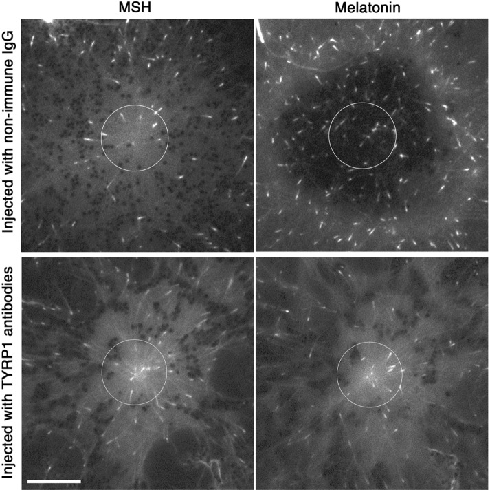 FIGURE 2:. Pigment aggregation signals do not stimulate MT nucleation on the centrosome. Fluorescence images of melanophores expressing EGFP-EB1 injected with either control nonimmune IgG (top) or TYRP1 antibodies (bottom) treated with MSH (left) or melatonin (right); circles (D = 12 μm) outline the areas used for counting EGFP-EB1 comets; in the control cell, which aggregated pigment granules, melatonin treatment induced a significant increase in the number of EGFP-EB1 comets in the centrosome area, whereas in the TYRP1 antibody–injected cell, which did not accumulate pigment granules in the cell center, the number of comets surrounding the centrosome did not change significantly after stimulation with melatonin; bar, 10 μm.