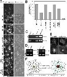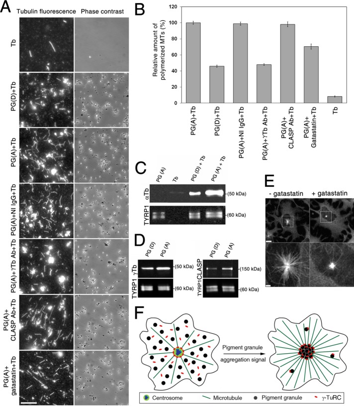 FIGURE 4:. Pigment granule aggregation signals increase nucleation of MTs on pigment granules, and this increase correlates with the recruitment of γ-tubulin. (A) Fluorescence (left) and phase contrast (right) images of pellets of immunostained MTs assembled by polymerization of twice-cycled tubulin incubated alone or with different pigment granule preparations; shown are images from (Tb) alone, (PG(D)+Tb) pigment granules isolated from cells treated with MSH to induce granule dispersion, (PG(A)+Tb) pigment granules from cells treated with melatonin to trigger aggregation and preincubated with buffer only, (PG(A)+IgG+Tb) pretreated with nonimmune rabbit IgG, (PG(A)+ γ-Tb antibody+Tb) pretreated with γ-tubulin antibodies, (PG(A)+CLASP antibody+ Tb) pretreated with CLASP antibodies, or (PG(A)+gatastatin+Tb) pretreated with γ-tubulin inhibitor gatastatin. Pigment granules increased the amount of assembled MTs, and this effect was greater in the case of granules isolated from melatonin- compared with MSH-treated cells; preincubation of granules with γ-tubulin antibodies or gatastatin but not with nonimmune IgG or CLASP antibodies reduced the amount of assembled MTs; bar, 10 μm. (B) Quantification of the number of assembled MTs in samples shown in A; each bar represents the average value of 30 measurements in two independent experiments; the data are expressed as percentage of average number of MTs assembled in the presence of pigment granules isolated from melatonin-treated cells and incubated with relevant buffer, which is taken as 100%; error bars are mean ± SEM. (C) Comparison of MT nucleation activity of pigment granules isolated from melanophores treated with MSH or melatonin by immunoblotting of granule pellets with α-tubulin antibodies; blots with α-tubulin (top) or TYRP1 (bottom; loading control) antibodies of pellets from samples containing pigment granules isolated from melatonin-treated cells (PG(A)), purified tubulin (Tb), or mixtures of purified tubulin with pigment granules isolated from MSH- or melatonin-treated melanophores (PG(D)+Tb, and PG(A)+Tb, respectively); α-tubulin bands are absent from pellets of pigment granules or tubulin preparations (an indication that pigment granule preparations do not contain significant amounts of tubulin and that MTs do not assemble in the absence of pigment granules) but present in the pellets of mixtures of purified tubulin with pigment granules (an indication of MT nucleation on pigment granules); the amount of α-tubulin is significantly higher in the case of pigment granules isolated from melatonin-treated cells, suggesting stimulation of MT nucleation by the granule-aggregating signals. (D) Immunoblotting of preparations of purified pigment granules isolated from melanophores treated with MSH (left, PG(D)) or melatonin (right, PG(A)) with antibodies against γ-tubulin (left, top), CLASP (right, top) or TYRP1 (loading control; left and right, bottom); γ-tubulin and CLASP levels are increased in preparations of pigment granules isolated from melatonin-treated cells, which suggests that pigment-aggregation signals stimulate recruitment of γ-tubulin and CLASP to pigment granules. (E) Fluorescence images of melanin-free melanophores recovering from MT depolymerization in the absence (left) or presence (right) of gatastatin (30 μM); bottom, high-magnification images of boxed areas shown in the top; gatastatin partially inhibits MT outgrowth from the centrosome; bars, 10 μm (top), 2 μm (bottom). (F) Hypothesis on the stimulation of pigment aggregation by recruitment of γ-tubulin to pigment granules.
