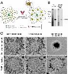FIGURE 1:. Microinjection of TYRP1 antibodies induces formation of pigment granule clusters with reduced ability to move to the cell center. (A) Design of a granule cross-linking experiment; antibodies against TYRP1 link neighboring pigment granules to each other, inducing formation of pigment granule clusters unable to efficiently move along MTs because of their large size. (B) Immunoblotting of cell extract (left) and lysate of pigment granules (right) with TYRP1 antibodies; left and right lanes of each pair correspond to silver-stained gels and immunoblots, respectively; in cell extract and lysate of pigment granules, antibodies recognize a single TYRP1 band with molecular mass of ∼60 kDa. (C) Phase contrast images of melanophores microinjected with control nonimmune IgG (top) or TYRP1 antibodies (bottom) and treated to aggregate pigment granules; in each row, images show the distribution of pigment granules before (left) or 30 min after (middle) microinjection or 20 min after treatment of microinjected cells with melatonin to induce pigment aggregation (right); microinjection of control IgG does not significantly change the distribution of pigment granules and does not prevent their aggregation in the cell center, whereas microinjection of TYRP1 antibodies induces formation of peripheral granule clusters that fail to aggregate in the cell center after stimulation with melatonin; bar, 10 μm.