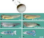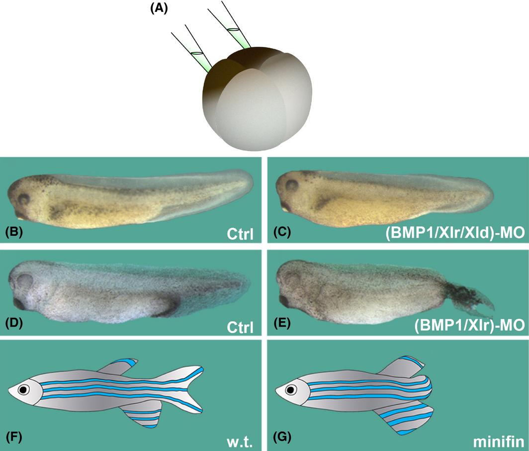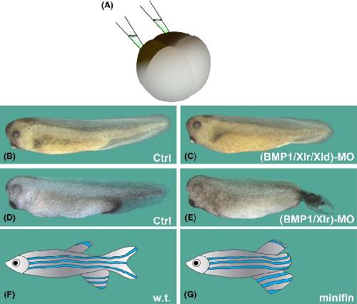 Depletion of Xenopus Tolloids with antisense morpholino oligos results in embryos with reduced ventralposterior structures. Note that this phenotype is the opposite of that of depletion of Sizzled. (A) Schematic diagram showing targeted injection of Tolloid MO mixtures into the ventral blastomeres of a four-cell Xenopus embryo. Embryos were analyzed at late tailbud stages (stage 34 onward) in at least five independent experiments; embryos that did not survive until tailbud were discarded and not scored. (B,D) Control embryos developed normally (n = 163). (C) 66% of the embryos (n = 53) injected with a triple mixture of Tolloid Morpholinos (BMP1/Xlr/Xld-MO) developed posterior defects with shorter tail and reduced ventralfin (which indicates lower BMP signaling). (E) A double mixture of BMP1 and Xlr MOs produced results with similar penetrance (67%, n = 68); shown here is the most affected embryo, with a severe truncation of the tail. (F,G) The Xenopus results phenocopy the minifin mutation in zebrafish, in which the homologous Tolloid gene is inactivated and leads to tail defects (drawing based on results from Connors et al. 1999).