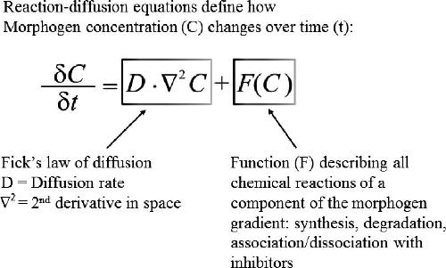 Example of a partial differential equation of the type formulated by Alan Turing in 1952 to describe the changes in morphogen concentration (δC) over time (δt). The right side of the equation shows that, following Fick's law of diffusion, the change in concentration of a morphogen at any given point is proportional to its diffusion rate and to the second derivative in space of morphogen concentration. In addition, the change in morphogen concentration is also a function (F) of all the chemical reactions it undergoes. This insight brought physics, chemistry and mathematics into developmental biology.