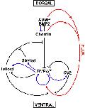 The Chordin/Tolloid/BMP biochemical pathway is conserved in many different animal phyla. Although the core signaling mechanism is ancestral to many organisms, its flexibility to regulatory changes provide a molecular pattern to generate a myriad animal forms. The homologue of Chordin is called Sog in some animals, and BMP called Dpp. A Chordin/Tolloid/Dpp system was already present in the sea anemone Nematostella, a primitive diploblast (two germ layers). This D-V patterning system is dedicated to generating a BMP signaling gradient spanning the entire gastrula embryo. Illustration modified and reproduced from Bier & De Robertis (2015) with permission from AAAS Publishing. Copyright 2015. Sketches of organisms by Dr.Valentino Gantz are gratefully acknowledged.