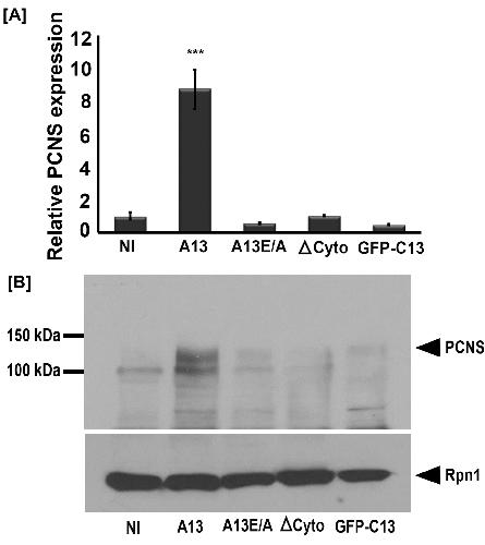 Figure 3: Full-length adam13 induces pcdh8l expression in naïve ectoderm (animal 858 cap cells). One-cell stage embryos were injected with mRNA encoding various forms of 859 adam13 (1 ng). Animal cap (AC) explants were dissected at stage 9 and grown in 0.5X 860 MBS until sibling embryos reached stage 18 to 20. mRNA and protein was extracted from AC for analysis of 861 pcdh8l. (A) Quantitative real-time PCR from mRNA isolated 862 from 10 animal caps. The relative level of pcdh8l expression was normalized to GAPDH. 863 (B) Western blot for pcdh8l protein using mAb2F4. 30 AC were used to extract protein 864 from embryos injected with various adam13 constructs. Western blot shows induction of 865 pcdh8l by full-length adam13, whereas other constructs fails to induce pcdh8l expression. 866 adam13 (A13), non proteolytic adam13 (A13E/A), adam13 lacking a cytoplasmic domain 867 (ïCyto), isolated adam13 cytoplasmic domain (GFP-C13). Error bars represent standard 868 error to the mean (Mean± S.E.M). One-way ANOVA was performed to determine 869 statistical significance. Statistically significant at ***p < 0.001 |