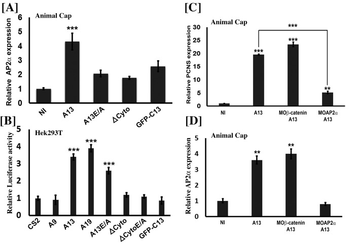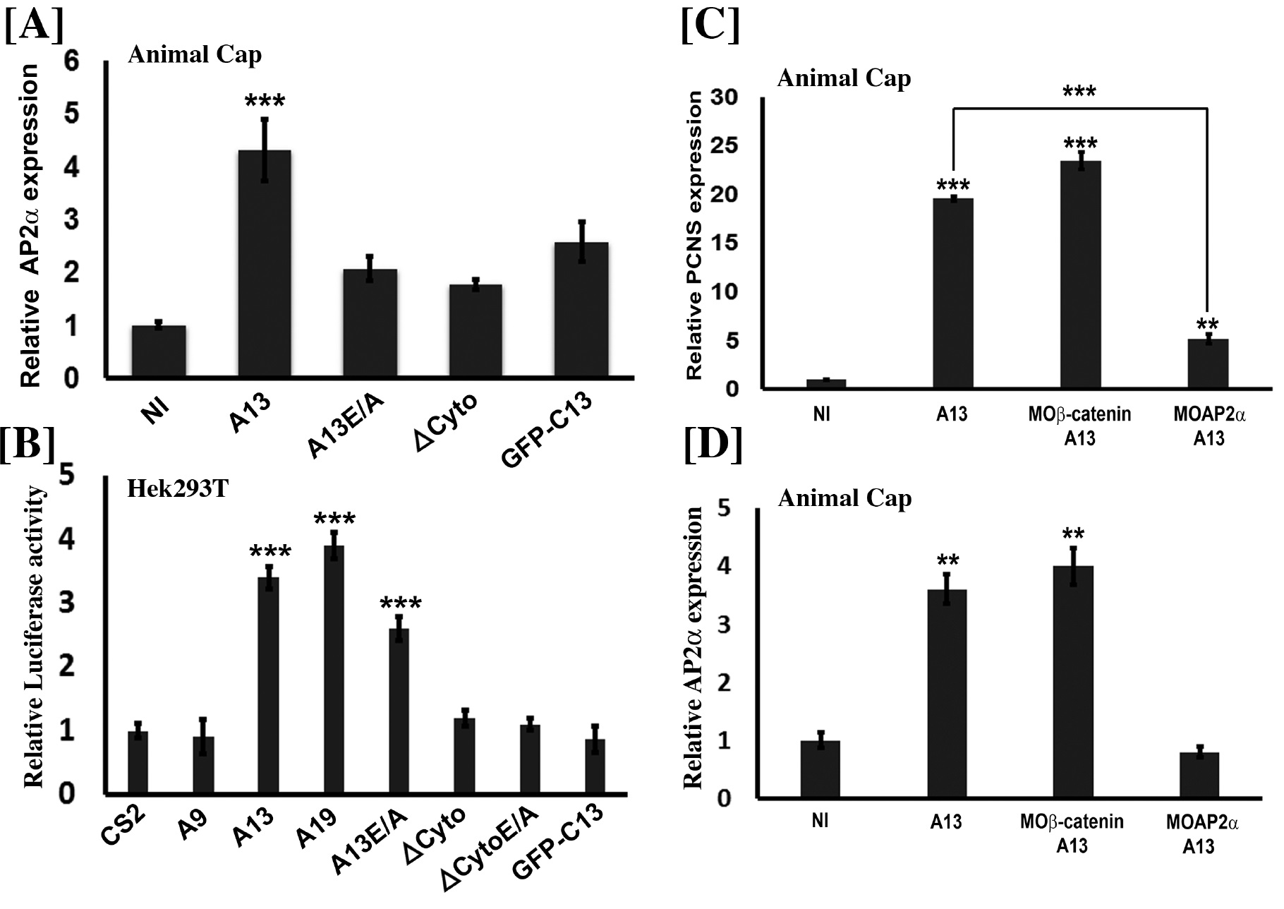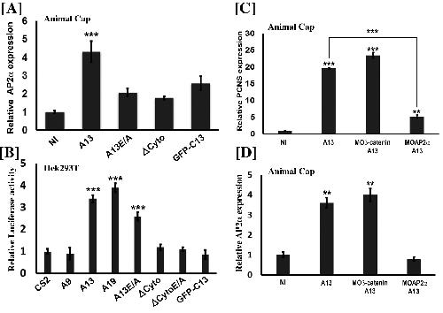 Figure 5: Adam13 induces pcdh8l via AP2ï¡. (A, C, D) Relative expression of AP2ï¡ and pcdh8l in naïve ectoderm (animal cap) by real-time PCR. One-cell stage embryos were injected with 1 ng of the various adam13 constructs and morpholinos and embryos were collected at stage 9 to dissect animal cap cells (AC). AC were grown in 0.5X MBS until sibling embryos reached stage 20 to 22. Messenger RNA was extracted from 10 AC for gene expression analysis. Expression was normalized using GAPDH and compared to the expression in non-injected AC (NI). (A) Real-time PCR data show that adam13 can induce AP2α by more than 4 fold. Both proteolytic activity and the presence of the cytoplasmic domain are essential for full activation. (B) Luciferase activity of AP2α promoter in Hek293T cells show induction by adam13 and ADAM19 but not ADAM9. For each transfection the Luciferase values were normalized to the Renilla values driven by the CMV promoter. In these assays, the absence of proteolytic activity (A13E/A) reduced AP2ï¡ induction only slightly, while the deletion of the cytoplasmic domain (ïCyto) prevented the activity. (C) Induction of AP2ï¡ï by adam13 was prevented by the KD of AP2ï¡ (10 ng of MOAP2ï¡) but not ï¢-catenin (20 ng of Moï¢-catenin). (D) Expression of AP2ï¡ in response of adam13 also depends on AP2ï¡ but not ï¢-catenin. Error bars represent standard error to the mean (Mean± S.E.M). One-way ANOVA was performed to determine statistical significance. Statistically significant at **p < 0.01, ***p < 0.001. |