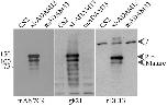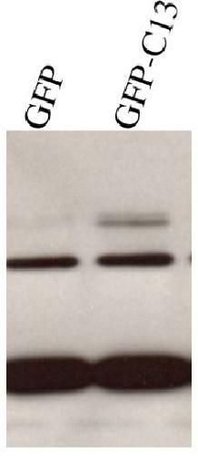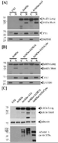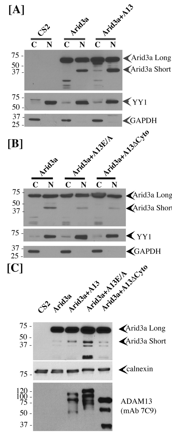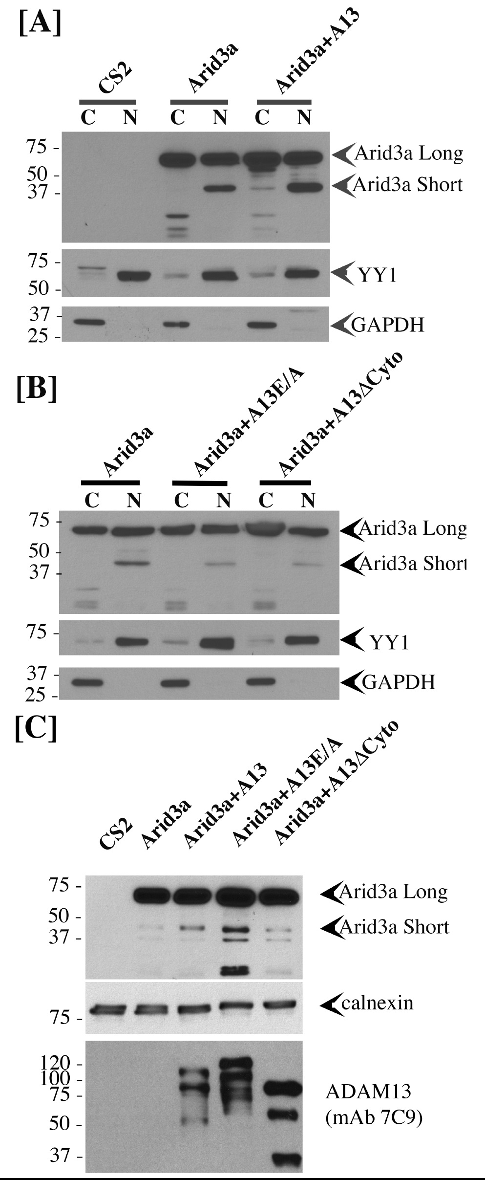 Figure 10: adam13 regulates arid3a post-translational modification. Western blot from transfected Hek293T cells. (A-B) Cytoplasmic (C) and nuclear (N) extracts from cells transfected with the empty vector (CS2), Arid3a-flag, adam13 (A13) or both. The blots were re-probed with the transcription factor YY1 as a nuclear marker and GAPDH as a cytoplasmic marker. The full-length Xenopus laevis Arid3a is detected at approximately 60 kDa (Arid3a Long). A shorter fragment is detected at about 40 kDa (Arid3a Short). (A) Co-transfection of adam13 with Arid3a increases the Arid3a protein level in the cytoplasm by 30% and the shorter fragment of Arid3a in the nucleus by 5 folds. (B) Co-transfection of Arid3a with the proteolytically inactive mutant adam13 (A13E/A) or the mutant lacking the cytoplasmic domain (A13ïCyto) does no increase the shorter fragment in the nucleus. (C) Membrane extract from Hek293T cells transfected with Arid3a-flag and the adam13 constructs. Co-transfection of Arid3a with adam13 increases the intensity of the 40 kDa Arid3a fragment. This is not observed in the absence of the adam13 cytoplasmic domain. In contrast, a much more significant increase is observed when Arid3a is co-transfected with the A13E/A mutant. |