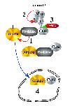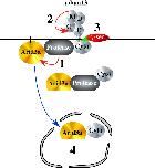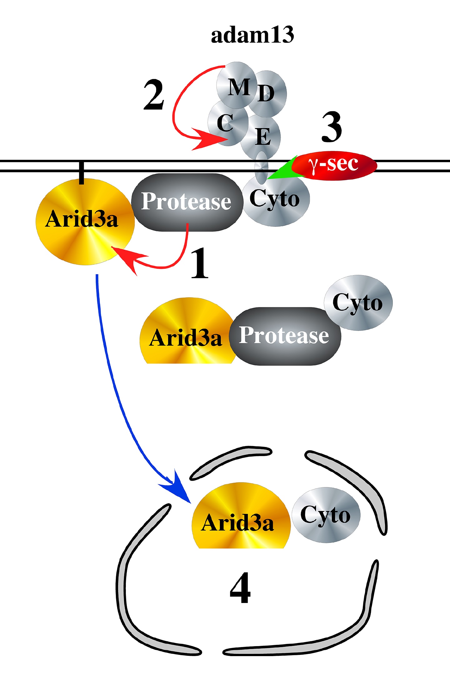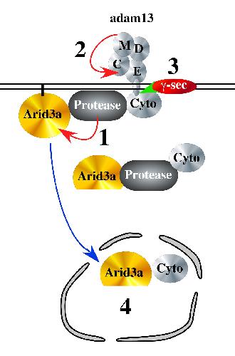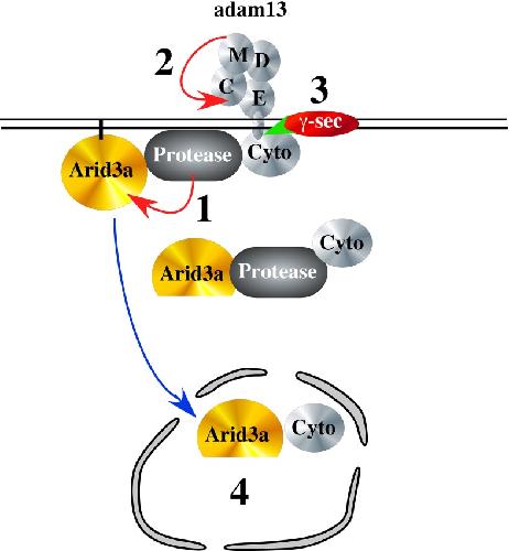 Figure 11. Hypothetical model of adam13 function: Adam13 at the membrane may associate with a cytoplasmic protease that cleaves Arid3a (1) to generate the short form seen in Figure 10.Arid3a is localized to lipid raft via its palmytoylation. Once adam13 cleaves itself in the cysteine rich domain (2), gamma secretase cleaves the cytoplasmic domain of adam13 (3), releasing the complex that can translocate in the nucleus to activate tfap2α transcription. |