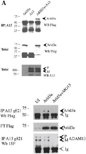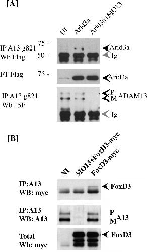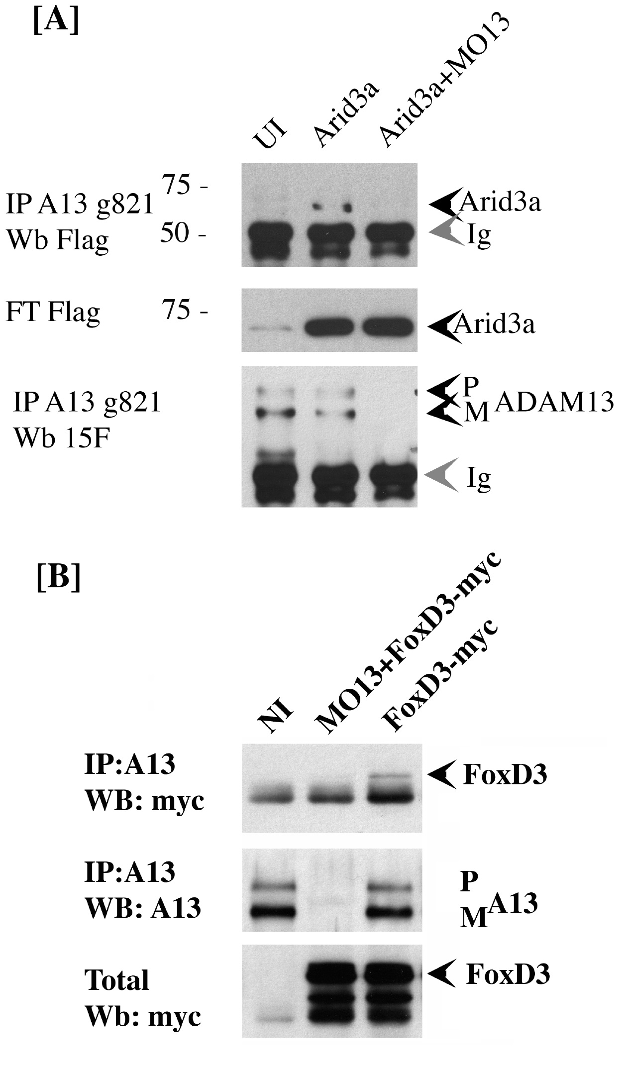 Figure 6: adam13 binds to arid3a 904 and foxd3. (A) Co-immunoprecipitation of arid3a905 flag with adam13. Arid3a-flag mRNA were injected in one cell stage embryos either alone or with the morpholino to adam13 (MO13.) Proteins were immunoprecipitated with a goat polyclonal antibody directed against the cytoplasmic domain of adam13 (g821, (24)) and blotted with M2 to detect the Flag-tag of arid3a. The flow through was used to detect arid3a. The immunoprecipitation were re-probed using 6615F to detect adam13 (35). (B) Co-immunoprecipitation of adam13 and FoxD3 from embryos. FoxD3-myc mRNA was injected at the one cell stage either alone or with MO13. Adam13 was immunoprecipitated using the goat polyclonal antibody to adam13 (g821), and the proteins were detected by western blot using either the myc antibody (9E10) or a rabbit antibody to adam13 (6615F). FoxD3 co-precipitated with endogenous adam13. |