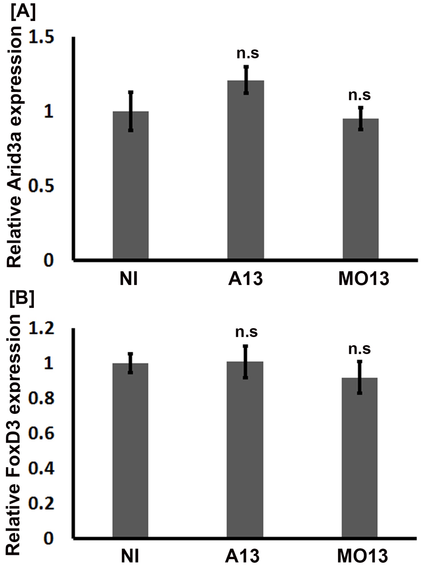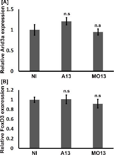 Figure 7: adam13 requires arid3a for induction of AP2α. Relative expression of AP2ï¡ (A) and pcdh8l (B) in animal caps from embryos injected with adam13 alone or with a morpholino to arid3a (20 ng) or FoxD3 (20 ng). Animal caps were extracted at stage 17. |