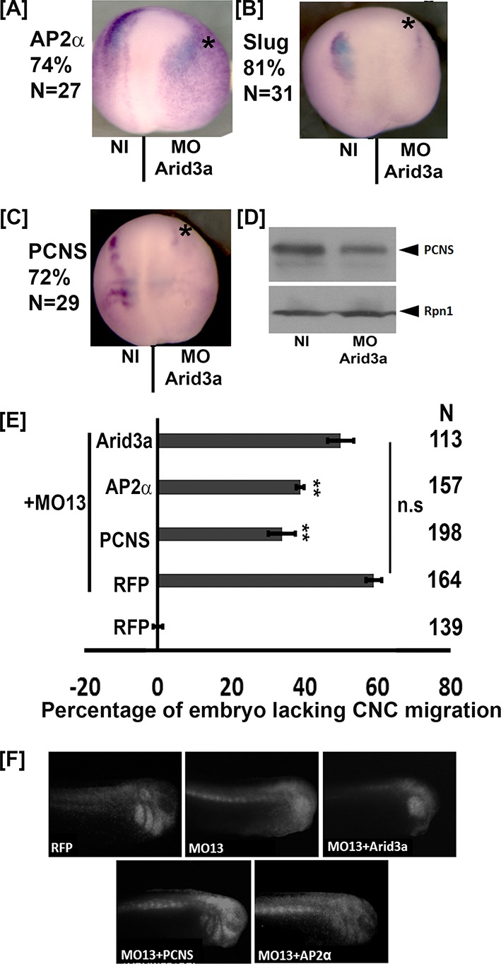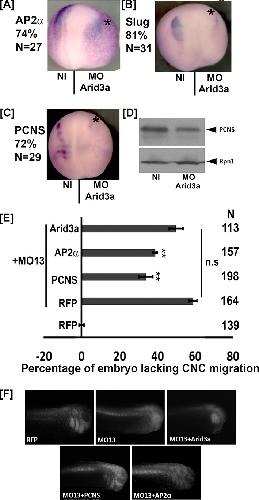 Figure 9: arid3a is critical for multiple gene expression in the CNC. (A-C) Representative dorsal view of neurula treated by whole mount in situ hybridization with probes for tfap2ï¡ (AP2ï¡ï©, snai2 (Slug) and pcdh8l (PCNS). Eight-cell stage embryos were injected in one dorsal animal blastomere with the arid3a morpholino (5 ng, Asterisk). The percentage of embryos with reduced signal in the injected side is given in percentage. N is the total number of embryos obtained from each case. (D) Western blot using mAb2F4 to detect pcdh8l (PCNS). Glycoproteins from 25 embryos were extracted and purify on ConA-agarose beads. Rpn1 was used as a loading control . (E) Histogram representing the percentage of embryos lacking CNC migration. One-cell stage embryos were injected with MO13. Control or KD embryos were further injected at the 8-cell stage in one animal dorsal blastomere with mRNA for RFP, PCNS, AP2ï¡ or Arid3a. Observation of the RFP fluorescence at stage 24-26 reveals that the inhibition of ation by adam13 KD is partially rescued 949 by pcdh8l and AP2ï¡ but not Arid3a. Error bars represent standard error to the mean (Mean± S.E.M). One-way ANOVA was performed to determine statistical significance. Statistically significant at *p < 0.05, **p < 0.01. (F) Representative examples of injected embryos. Posterior to the left, dorsal is up. |