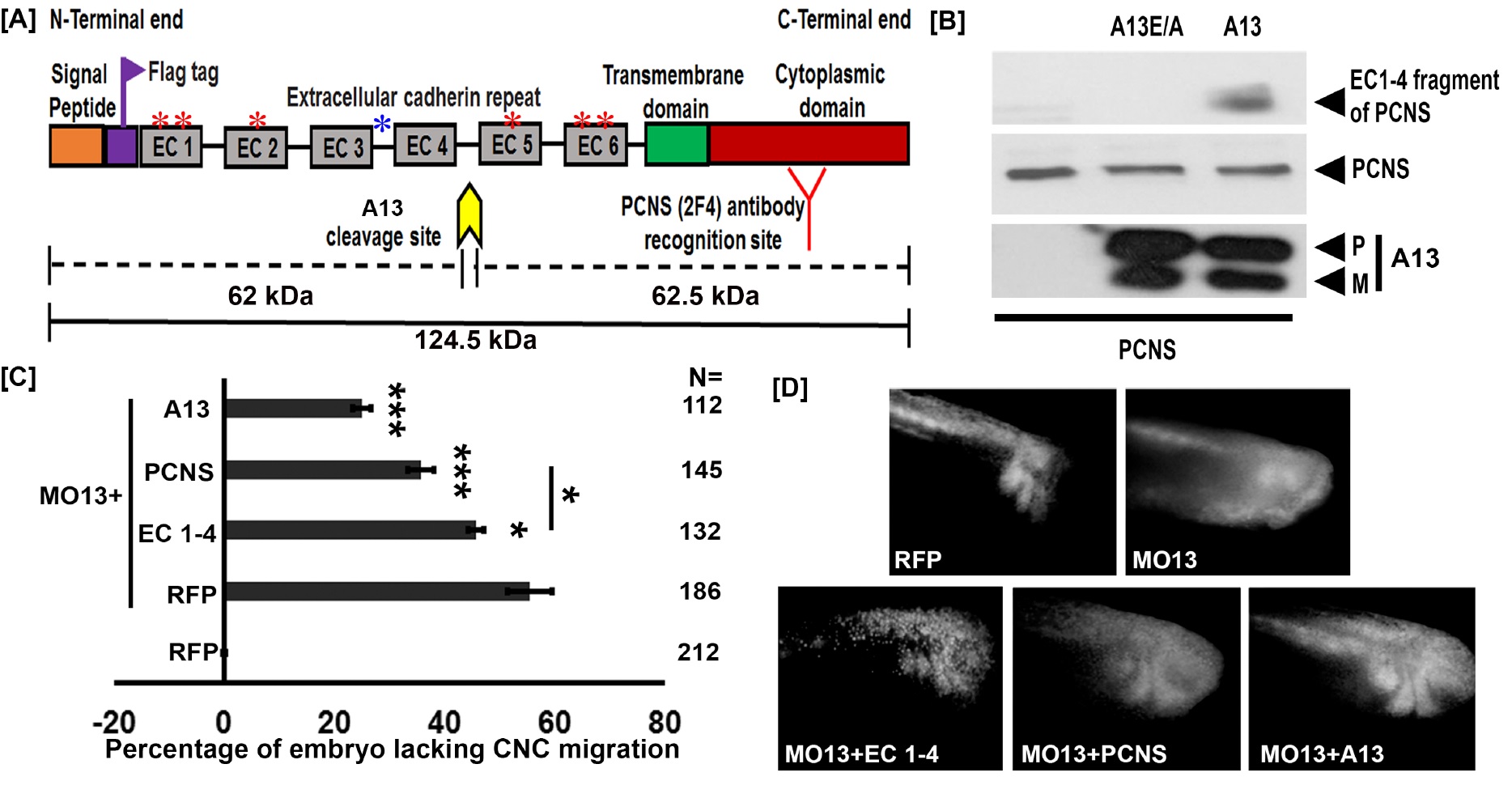 Figure 1: adam13 cleaves 792 pcdh8l. (A) Schematic representation of full length pcdh8l. A Flag tag (DYKDDDDK) was introduced just before the first cadherin repeat (EC1). The yellow arrow indicates the predicted cleavage site of adam13 based on the molecular weight of N- and C- terminal fragments. Red and blue asterisk indicate N and O glycosylation site respectively. The monoclonal antibody 2F4 was produced against the cytoplasmic domain (Red). (B) Western blot from transfected Hek293T cells. Glycoproteins from the conditioned media were purified on concanavalin-A agarose. The cleavage fragment was detected using the N-terminus Flag tag using the mAb M2. Total pcdh8l and adam13 were detected using mAb 2F4 and mAb 4A7, respectively. The Pro (P) and Metalloprotease (M) active forms of adam13 are indicated. (C) Histogram representing the percentage of embryos lacking fluorescent neural crest cell in the migration pathway. (D) Photographs of representative embryos with or without fluorescent migrating neural crest cells. Embryos were injected at the one-cell stage with a morpholino targeting adam13 (10 ng MO13). Messenger RNA for RFP alone or combined with the different constructs was injected at the 8-cell-stage in a dorsal animal blastomere. Each injection was compared to RFP injected in control embryos in which RFP positive cranial neural crest cells have successfully migrated into the branchial and hyoid arches (0% inhibition). N=number of embryos scored from three or more independent experiments. Error bars represent standard error to the mean. One-way ANOVA was performed to determine statistical significance. Statistically significant at *p < 0.05, ***p < 0.005. |