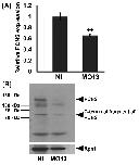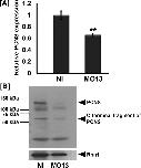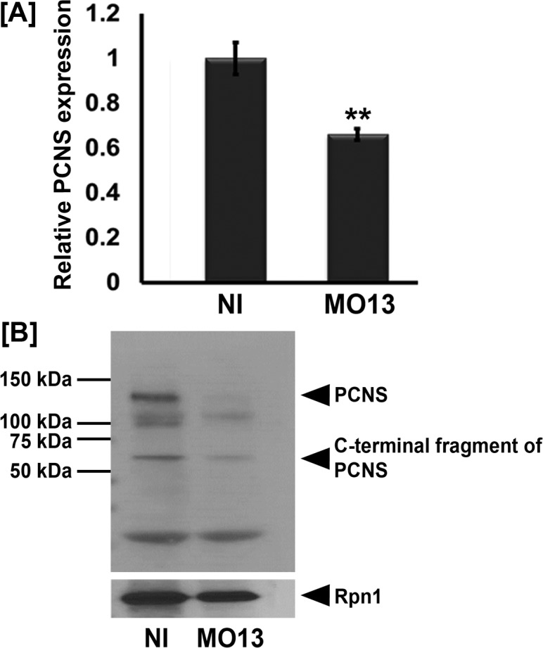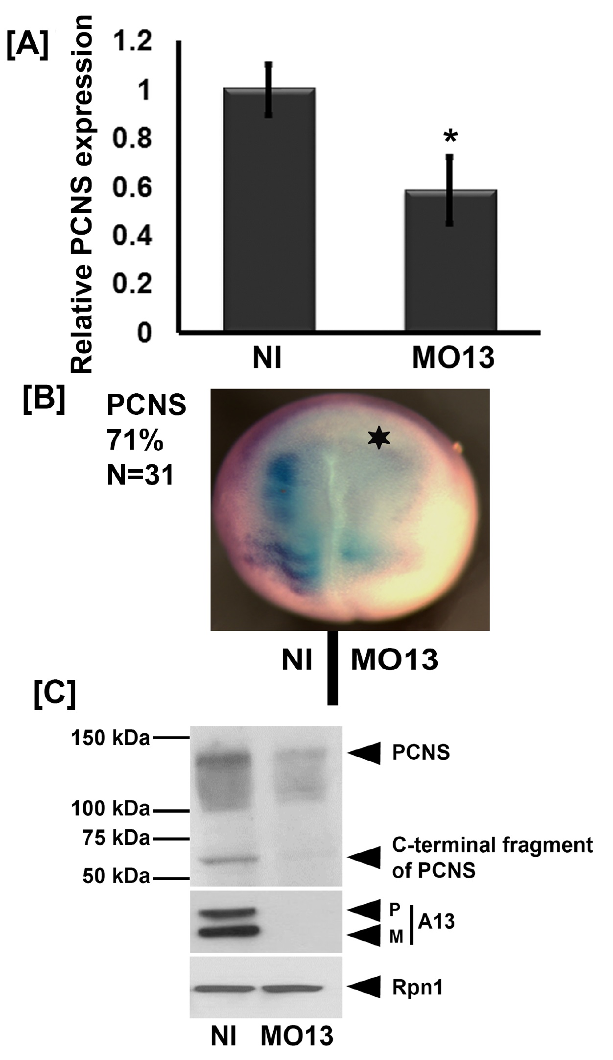 Figure 2: Adam13 knockdown reduces pcdh8l expression. (A) Relative mRNA expression of pcdh8l normalized to GAPDH obtained by real-time PCR. MO13 was injected at the one cell stage (10 ng) and embryos were collected at stage 20. Polyadenylated mRNA was extracted from non-injected and MO13 injected embryos (5 embryos each). (B) Representative images of whole mount in situ hybridization in which MO13 (5ng) was injected in one of the two blastomeres and non-injected side serves as control. Image shows reduced mRNA levels of pcdh8l in MO13 injected side (star, 71% of 31 embryos). (C) Western blot on glycoproteins isolated from either control (Non Injected) or knock down (10 ng MO13) stage 20 embryos (25 embryos each). MO13 efficiently prevents the translation of adam13 (A13) as well as reduces the pcdh8l protein level. A monoclonal antibody to Xenopus Ribophorin 1 (Rpn1) was used as a loading control. Error bars represent standard error to the mean (Mean± S.E.M). One-way ANOVA was performed to determine statistical significance. Statistically significant at *p < 0.05 |