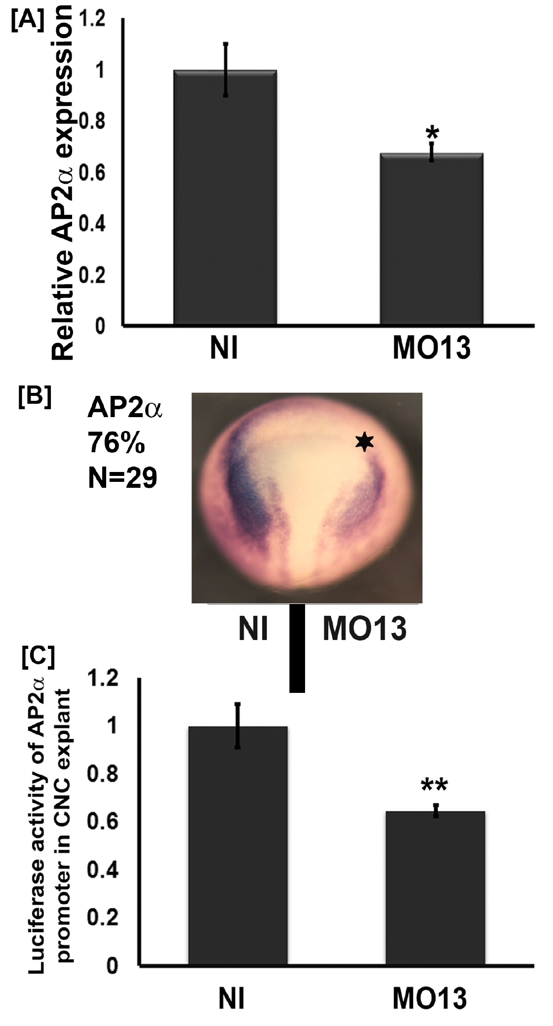 Figure 4. Adam13 knockdown reduces tfap2α expression. (A) Relative mRNA expression of AP2α normalized to GAPDH (5 embryos). Real-time PCR analysis shows a 40% decrease in AP2ï¡ expression in response to adam13 KD (B) Representative images of dorsal view of whole mount in situ hybridization with AP2ï¡. MO13 (5 ng) was injected in one of the two blastomeres (star). The non-injected side serves as control. adam13 KD reduces AP2ï¡ expression in 76% of the embryos (N=29). (C) Luciferase activity of AP2α promoter in cranial neural crest cells (CNC). One-cell stage embryos were injected with MO13 (10 ng). Control and KD embryos were further injected at the 8-cell stage with the AP2ï¡:luciferase reporter (100 pg) together with pRL-CMV (10 pg) in one animal dorsal blastomere. CNC explants were dissected from stage 15-17 embryos and individual explants were lysed to measure luciferase activity. The normalized values from 10 individual explants (two biological replicates) were used for each measure. Error bars represent standard error to the mean (Mean± S.E.M). One-way ANOVA was performed to determine statistical significance. 883 Statistically significant at *p < 0.05, **p < 0.01. |