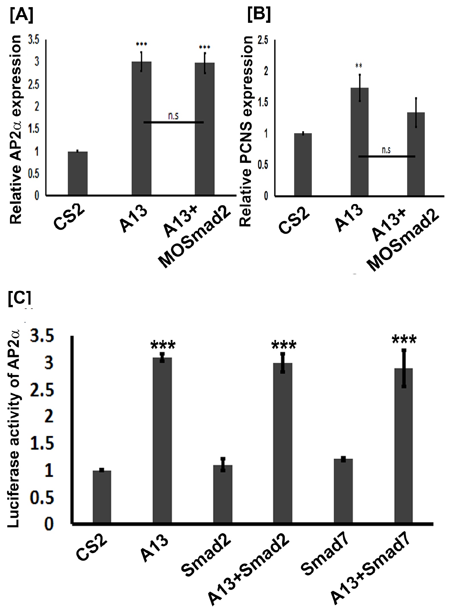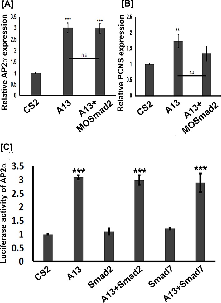 Figure 8: adam13 induction 926 of Ap2ï¡ and pcdh8l does not involve Smad2. (A-B) Relative expression of AP2ï¡ and pcdh8l in animal caps dissected from control embryos, or embryos injected with adam13 or adam13 and a morpholino to Smad2 (MOSmad2, 25 ng). C) Luciferase assays in Hek293T cells show no induction of AP2α promoter activity by Smad2 (0.5 μg) or Smad 7 (0.5 μg). Smad2 does not increase adam13 activation of the AP2ï¡ promoter, while Smad7 does not reduce adam13 induction of AP2ï¡ promoter. Smad2 and Smad7 were transfected with or without adam13 (0.5 μg) along with AP2α promoter-luciferase and the pRL-CMV (100 ng, 10 pg). The ratio of luciferase to renilla was used to normalize each transfection to the empty vector control (CS2). Error bars represent standard error to the mean (Mean± S.E.M). One-way ANOVA was performed to determine statistical significance. Statistically significant at **p < 0.01, ***p < 0.001. |