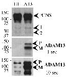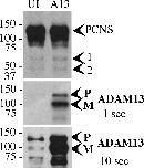 Figure 1âfigure supplement 2. adam13 overexpression increases pcdh8l fragments.Western blot with mAb 2F4 from glyctoproteins isolated from 20 embryos at stage 20. The intact full-length pcdh8l protein (PCNS) is indicated as well as two main fragments (arrowhead 1 and 2). All three forms are detected in uninjected embryos (UI) but the fragments are increased in embryos overexpressing adam13 (A13). The blot was re-probed with 15F, a polyclonal antibody directed against the adam13 cytoplasmic domain (Alfandari et al., 1997). The Pro (P) and Mature (M) forms of adam13 are indicated. Two exposures are provided to clearly detect the endogenous and overexpressed adam13 protein. |