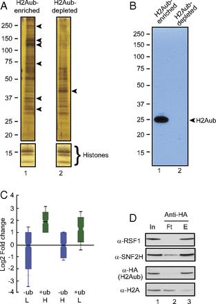 RSF1 preferentially associates with H2Aub-enriched nucleosomes in HeLa cells expressing HA-ubiquitin. (A) Silver staining of a protein gel containing equal amounts of H2Aub-enriched or -depleted mononucleosomes reveals polypeptides enriched specifically within each group of nucleosomes (arrowheads). Different staining times were used for core histones and the rest of the proteins. (B) Anti-HA immunoblot of a protein gel containing an aliquot of the above samples shows that a single protein corresponding to the H2Aub position containing HA-ubiquitin (arrowhead). (C) RSF1 is enriched in the H2Aub-enriched nucleosomes in the SILAC assays, shown by log2-fold enrichment of RSF1 abundance, quantified by the intensity of a RSF1 unique peptide (Fig. S1), in H2Aub-enriched (+ub) or -depleted (−ub) nucleosomes. H and L represent heavy and light lysine labeling, respectively. (D) Immunoblot analyses of proteins contained in the flow-through (Ft) or the eluate (E) of anti-HA IP of H2Aub-containing nucleosomes show that RSF1 is enriched in the H2Aub nucleosomes, along with SNF2H, another component of the RSF complex. In, input. Antibodies used are indicated at the left.